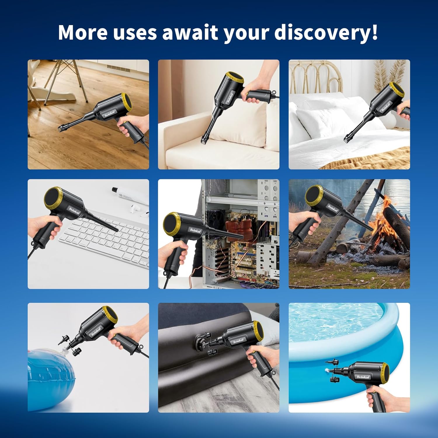 - 【3 types of nozzles】Round nozzles can be used for electronic devices such as laptops, keyboards, and printers. Flat nozzles with up-and-down moving brushes can be used in dusty areas such as PCs. The 3-in-1 nozzle can be used for products such as airbeds and lifeboats that need to be inflated quickly