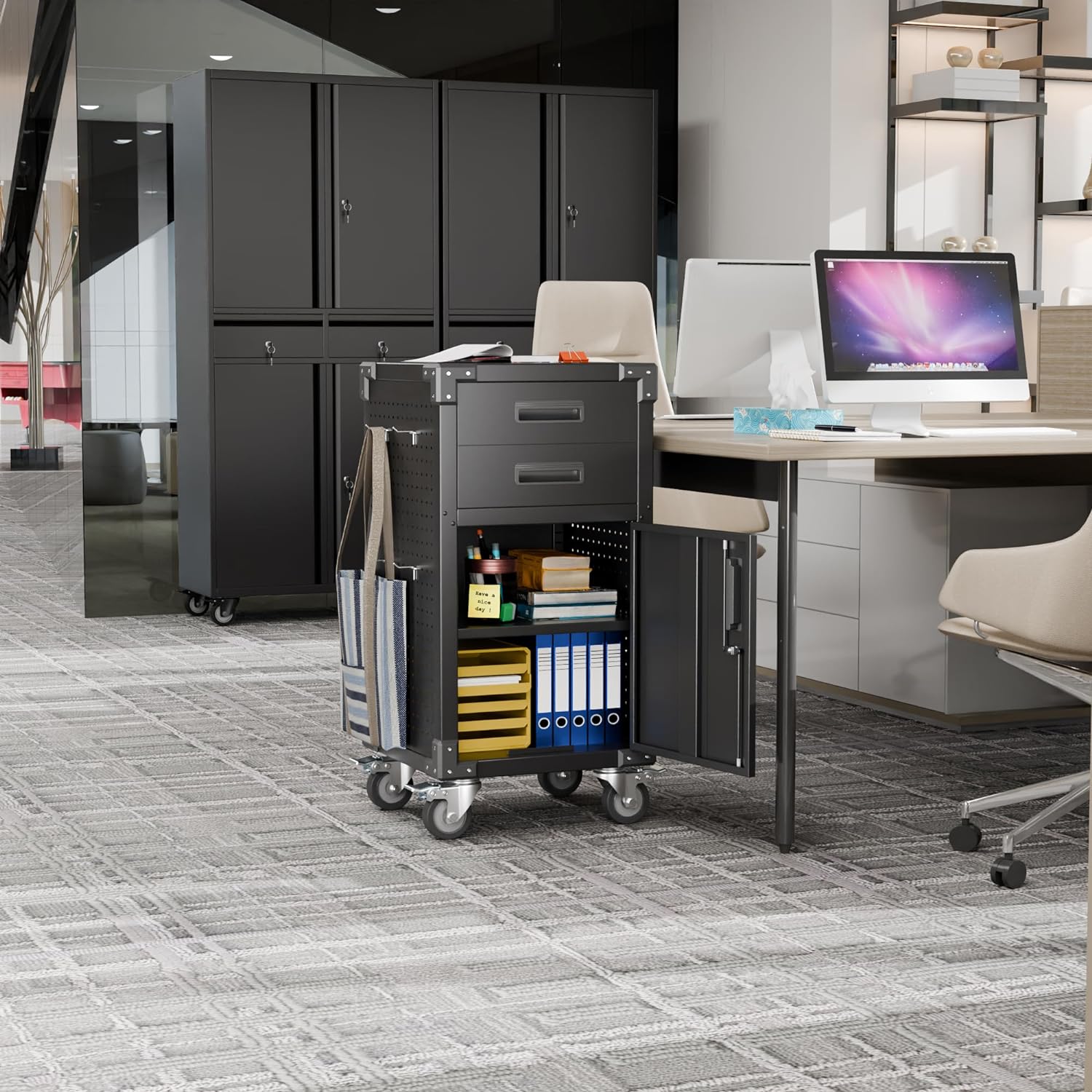 Garage Storage Cabinet, Metal Storage Cabinet with 1 Locking Door and 2 Drawers, Heavy Duty Rolling Workbench Table with Wheels and Pegboards for Garage, Office and Tool Room