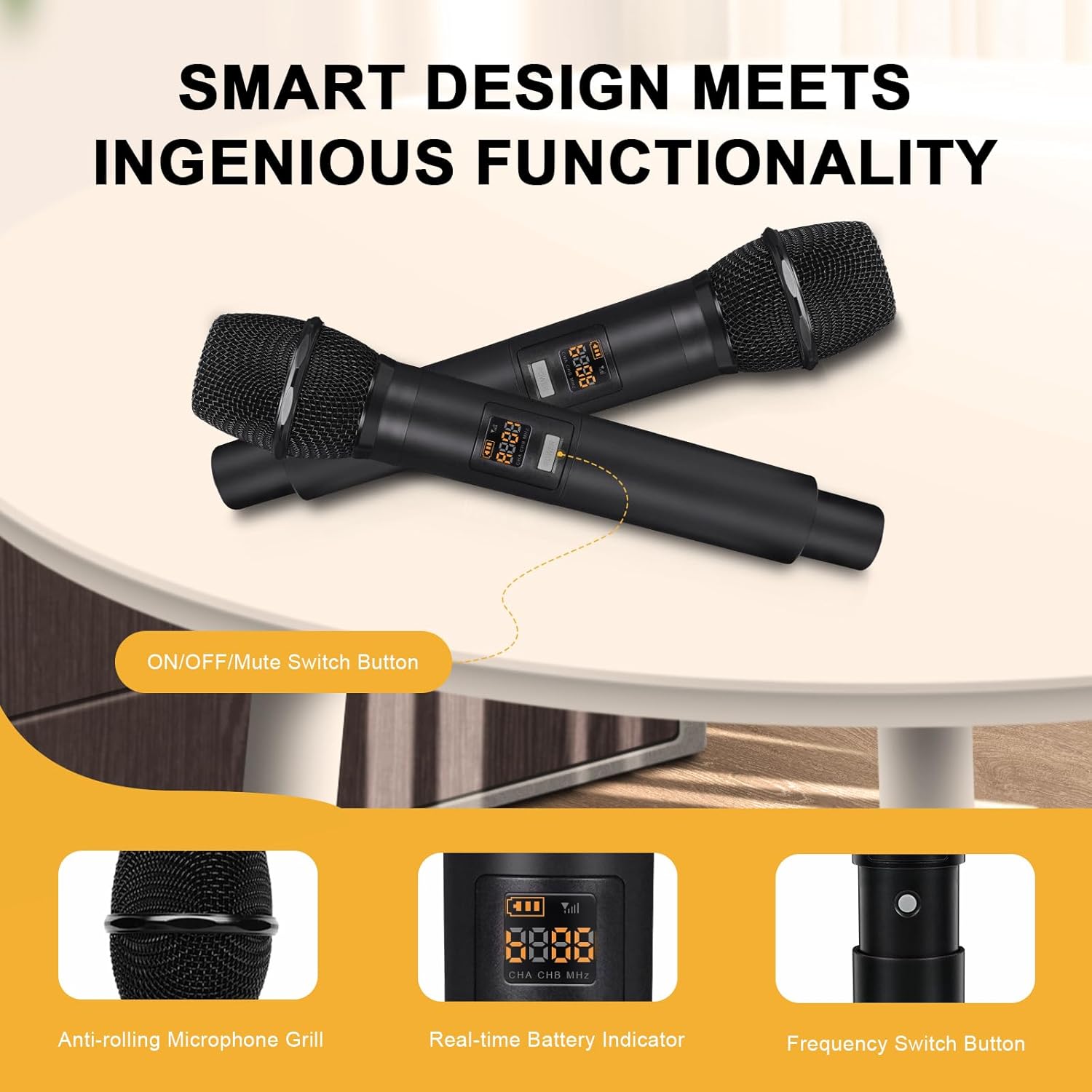- USER-FRIENDLY DESIGN: The dynamic handheld microphones feature a diamond-edged design that prevents rolling, keeping them securely in place on any surface. The main unitβs clear screen display prominently shows channel assignments, making it easy to identify and switch between channels. This thoughtful design of the microphone system ensures a seamless, stress-free experience, allowing you to focus entirely on your performance