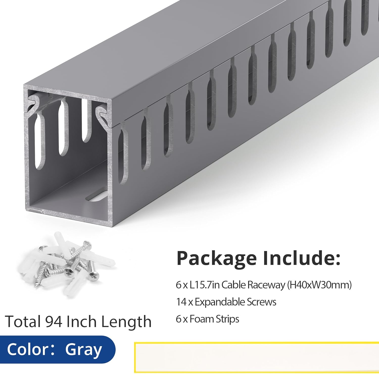 94.5in(6X L15.7in) Professional Server Rack Cable Management Raceway, H1.6in x W1.2in Cable Raceway Kit, Electrically Safe PVC Open Slot Wire Raceway for Under Desk/Computer/Network Cords, Grey