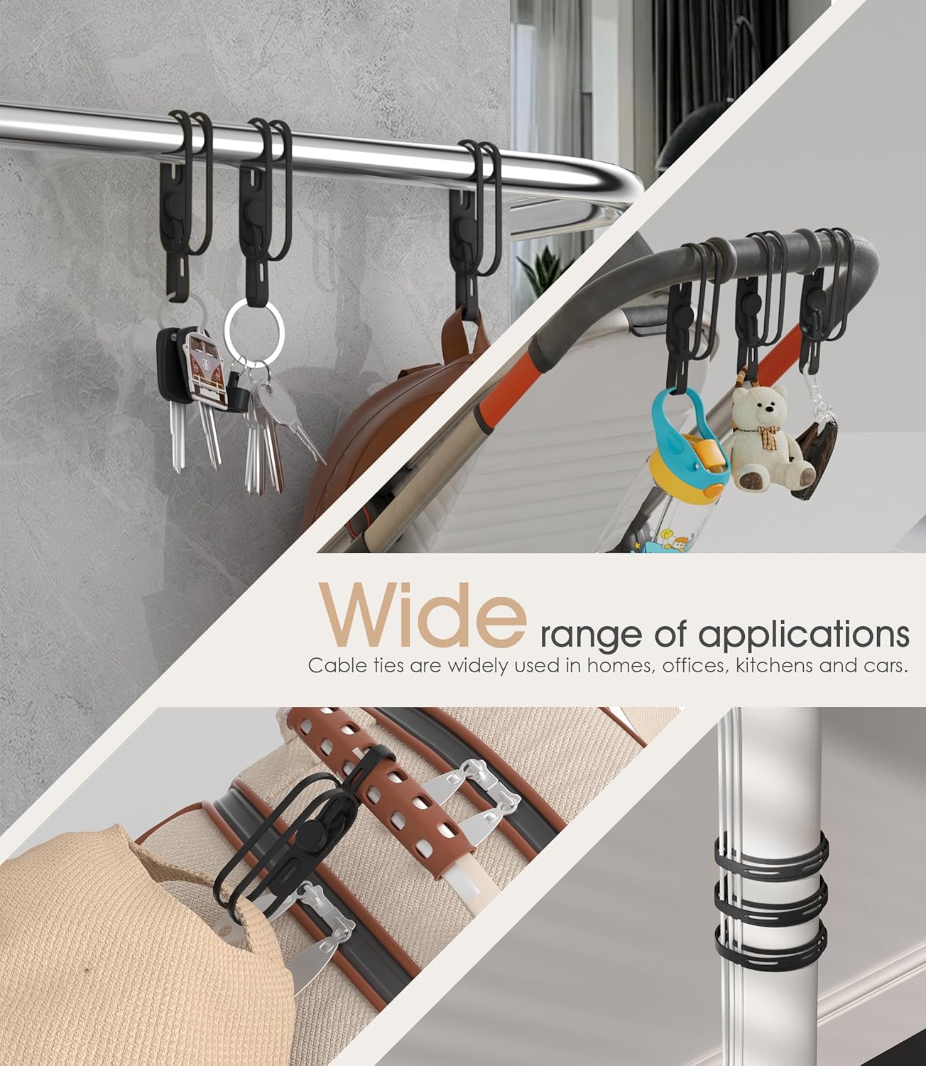 - 【Multifunctional Cable Ties】The design of this double-sided silicone tie with a wide buckle makes the binding more secure. It can not only be used for cable management, but also for storing keys, scissors and other convenient hanging objects at home, and for connecting hats and coats to backpacks when traveling, freeing your hands