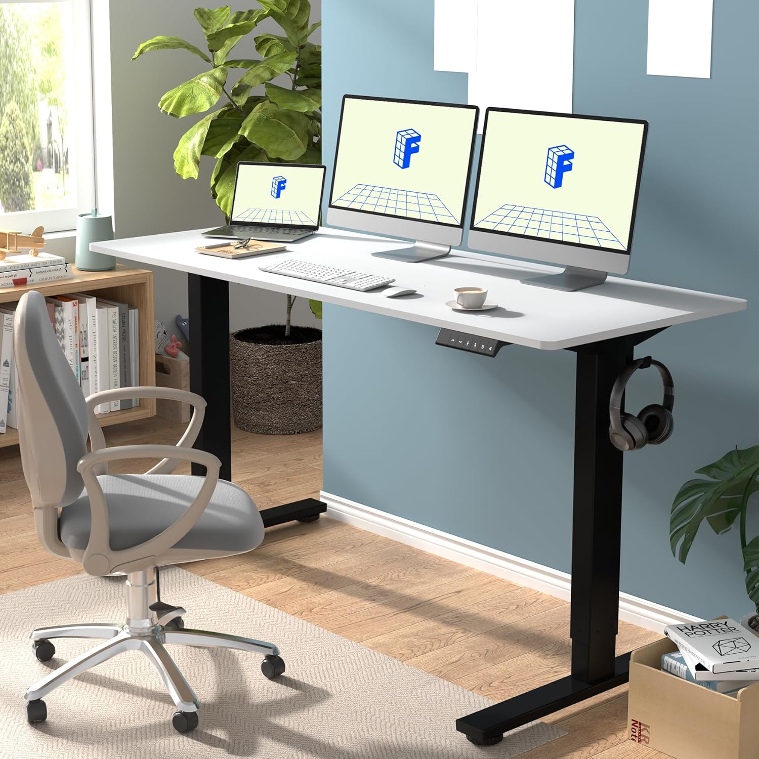 FLEXISPOT EN1 Whole-Piece Standing Desk 60"x24" Electric Height Adjustable Heavy Duty Steel Stand Up Desk Frame w/Automatic Smart Keypad (Black Frame + White Top, 2 Packages)