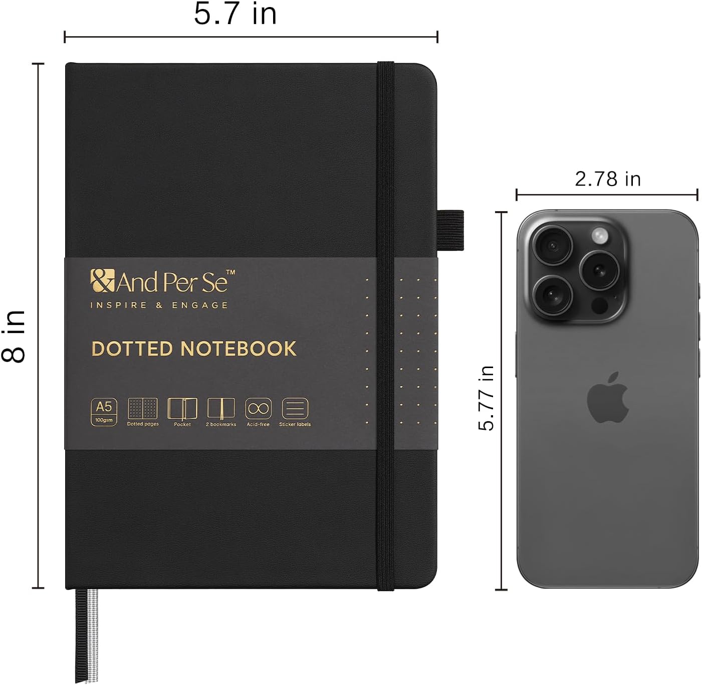 &And Per Se Dotted Journal Notebook (5 Packs), A5 Hardcover Leather Dotted Journal, 160 Pages 100 gsm Thick Paper, 3 Sheets of Stickers Included- 5.7'' x 8'' (Black