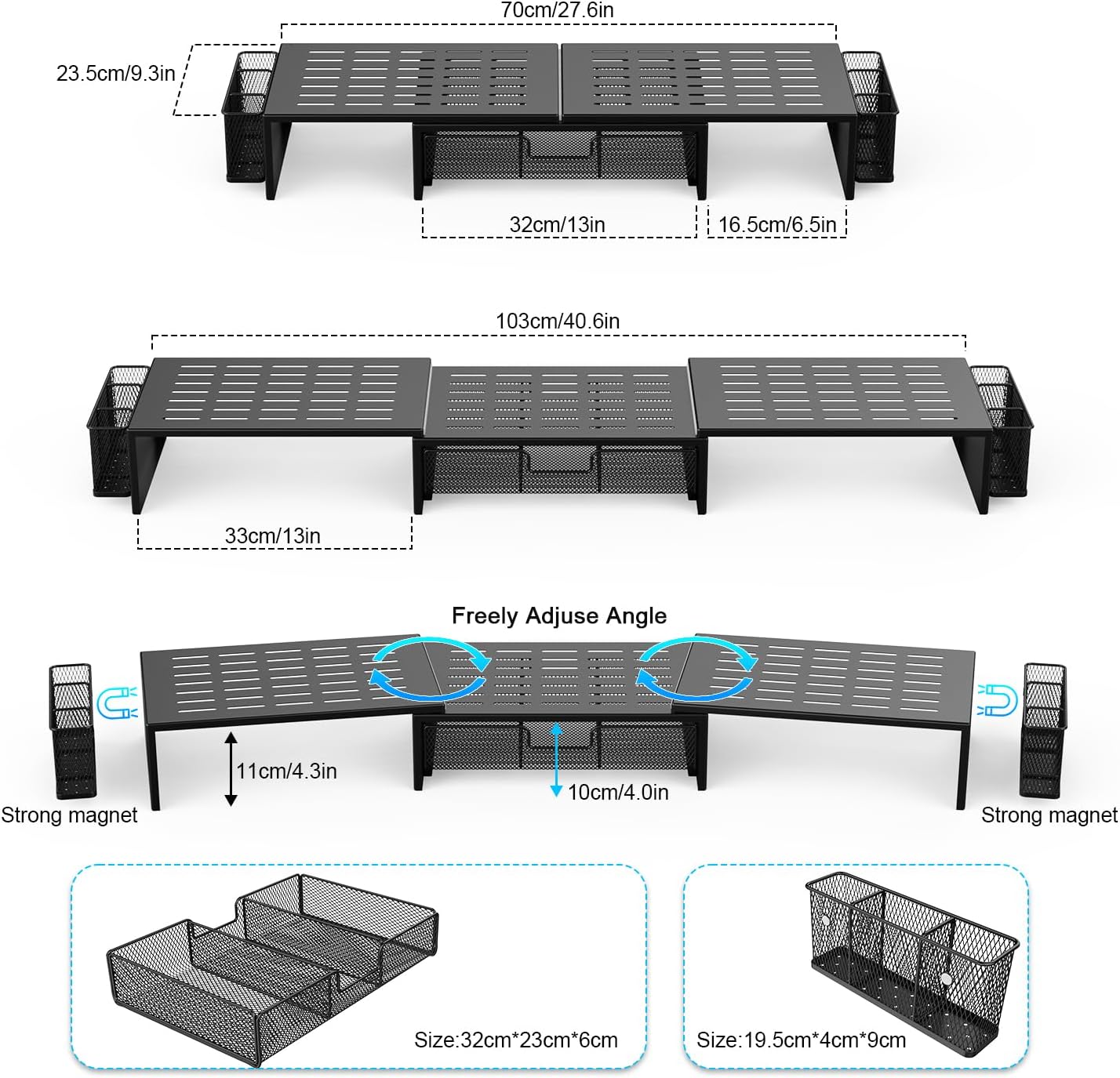 - 【Multiple configuration modes】: The desk monitor stand riser has adjustable length (27.6-40.6 inches) and angle, which can be freely adjusted according to your preferences, not only bringing you comfort, but also improving your work efficiency.