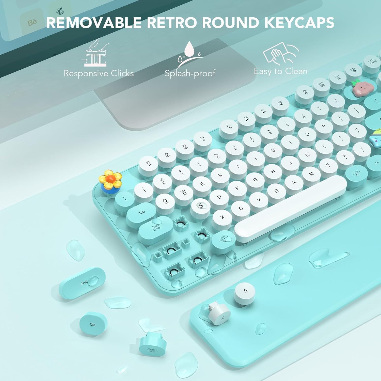 Wireless Keyboard, Round Keycaps, Retro Typewriter Keyboard with Detachable Wrist Rest, Sleep Mode, Foldable Legs, 2.4GHz Full-size Cordless Computer Keyboard for Windows/PC/Laptop (Robin Egg Blue)
