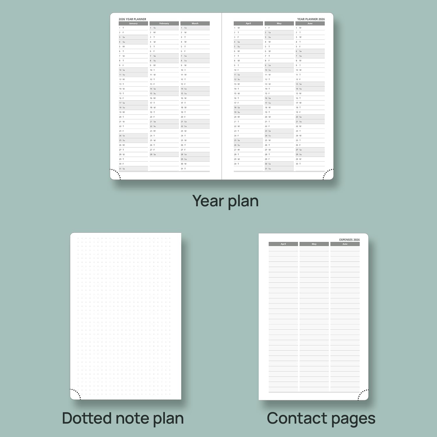 - EXTRA FUNCTION PAGES - Includes a 2025-2026 Yearly Overview, Holiday & Calendar, Monthly Expenses, Contact & Password pages, and 13 dotted notes pages for detailed jotting.