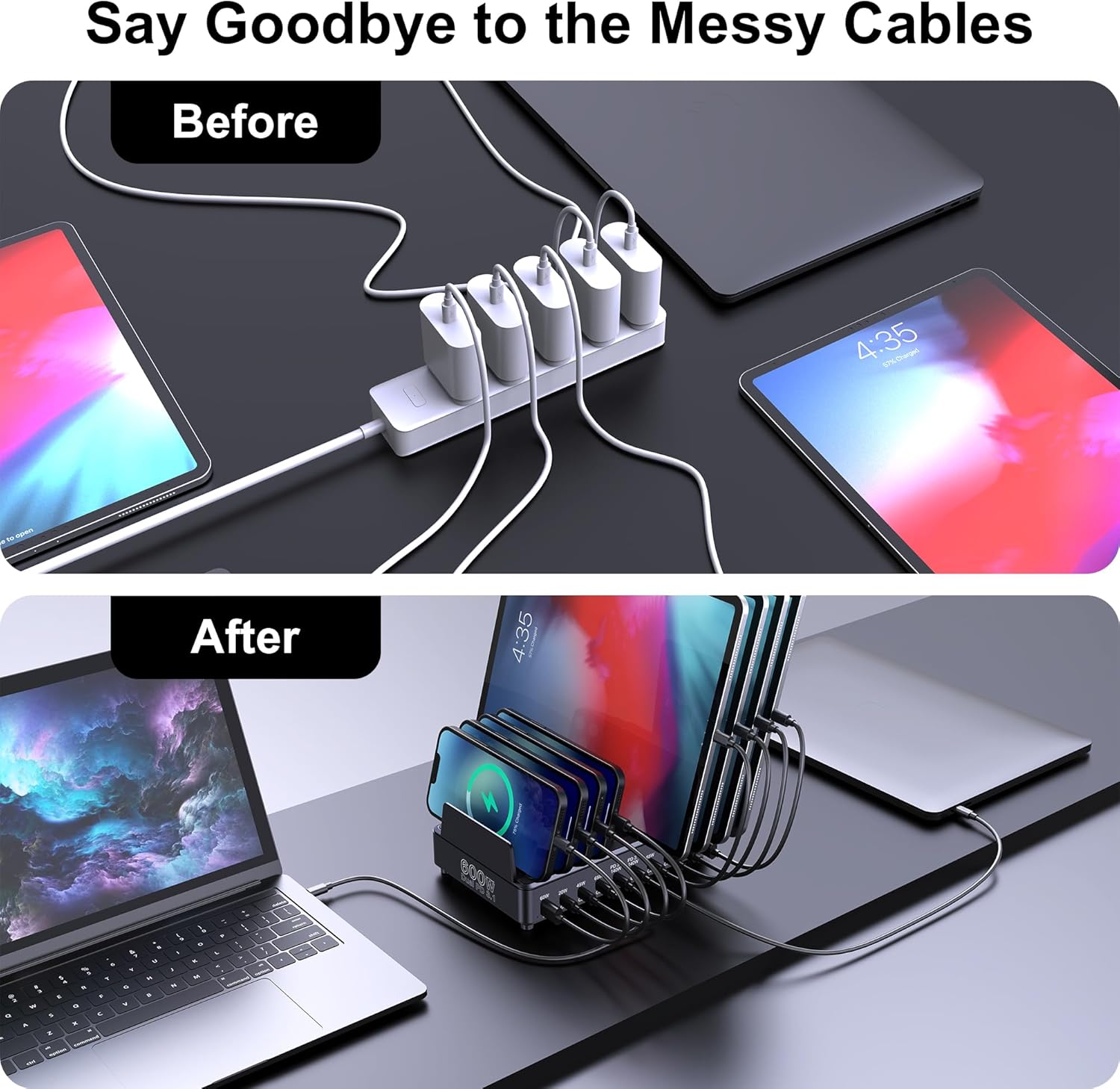 - Sturdy Slots: The housing body of this multi-port charging station is all together with solid construction and cannot be disassembled, and features a durability design made from high-quality, flame-retardant ABS material, ensuring a longer lifespan. We've specially designed 2 extra-wider and taller slots in the middle, each measuring 1.18" wide and 1.42" high to accommodate some thicker and bigger devices, like laptops or tablets, even with cases