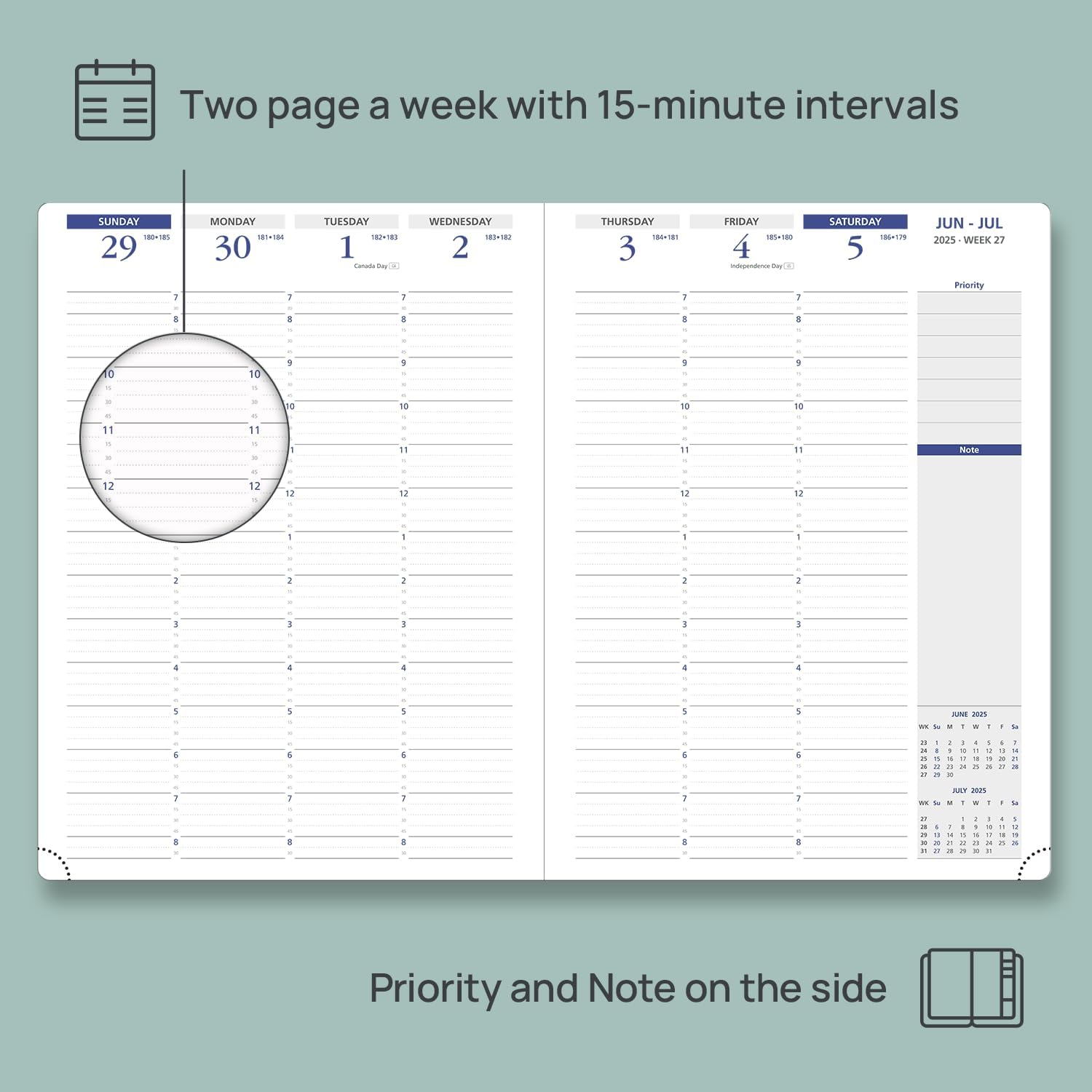 - EFFICIENT WEEKLY LAYOUT: One week per two page spreads in column-style starting from Sunday to Saturday. Quarter-hourly appointment times for every day are from 7: 00 a.m to 8: 00 p.m so that you can arrange your life for school of working easily.