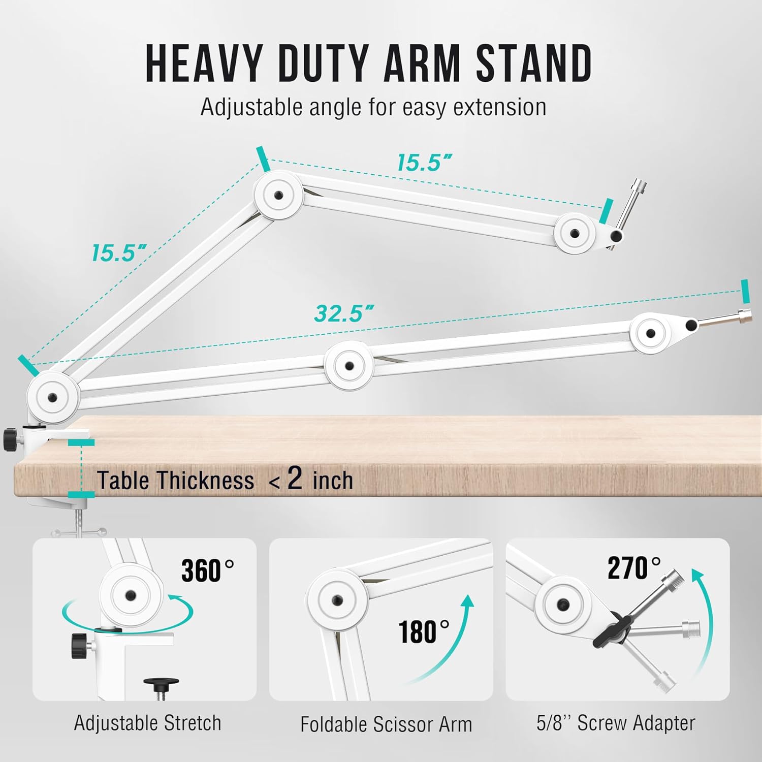 - [Robust Boom Arm for for Precise Positioning] The adjustable boom arm made of heavy duty material give horizontal and vertical angle adjustment for freely position of the XLR dynamic microphone with pinpoint accuracy. Its sturdy construction and smooth joints let you adjust PC microphone with boom arm where you need it, ensuring optimal sound quality for every recording.