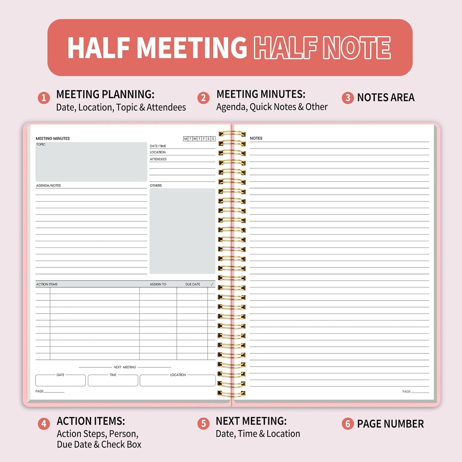 - Half Meeting Half Note: 1.MEETING PLANNING: Date, Location, Topic & Attendees 2.MEETING MINUTES: Agenda, Quick Notes & Other 3.NOTES AREA: Lined Page 4.ACTION ITEMS: Action Steps, Person, Due Date & Check Box 5.NEXT MEETING: Date, Time & Location 6.INDEX PAGE: Date, Title, Page Number, which will help create more effective meetings and good results.