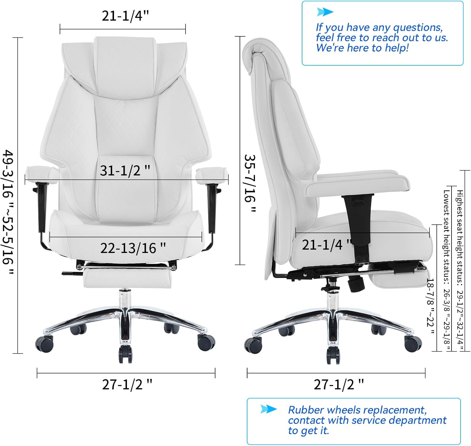 Big and Tall Office Chair with Footrest, PU Leather High Back Executive Office Chair 400lbs, Ergonomic Computer Chairs Lumbar Support for Heavy People (White)