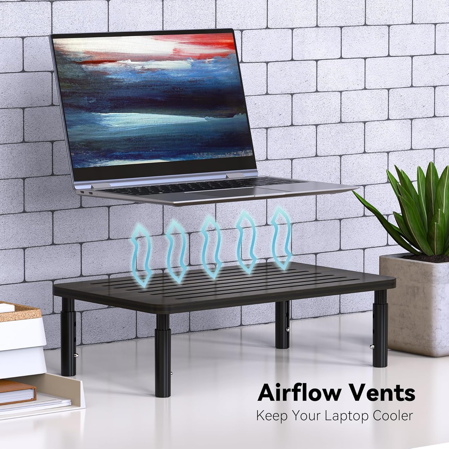 - Effective Heat Dissipation: Our monitor stand is crafted from high-quality bamboo, featuring a ventilated platform to prevent overheating and improve airflow for your electronic devices.Dimension-15.55”Wx9.25“Dx5.98"H(max)