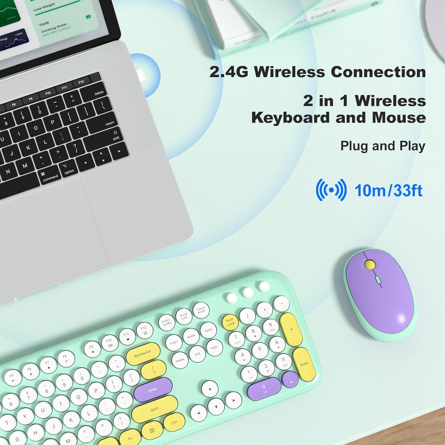 - Auto Sleep Mode: Our cute colorful keyboard and mouse wireless combos both require only 1 AA battery. Wireless keyboard and mouse automatically enter sleep mode after 5 minutes of inactivity, efficiently saving battery life and reducing the need for frequent replacements.