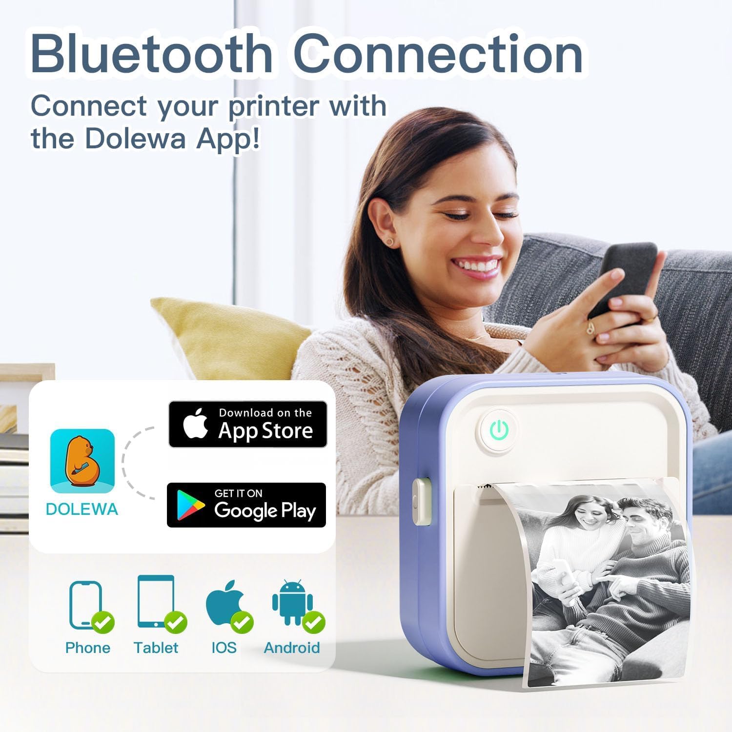 - USER-FRIENDLY: The mini pocket printer is compatible with IOS & Android phones /tablets via bluetooth connection. Fllow the steps: ①Long press for 3 seconds to turn on the portable thermal printer. ②Scan the QR code in the user manual to download the "DOLEWA" APP. ③Turn on bluetooth of your phone/tablet. ④Install the paper roll size as you need. ⑤ Connected the impresora portátil with the APP via bluetooth.⑥Start your printing