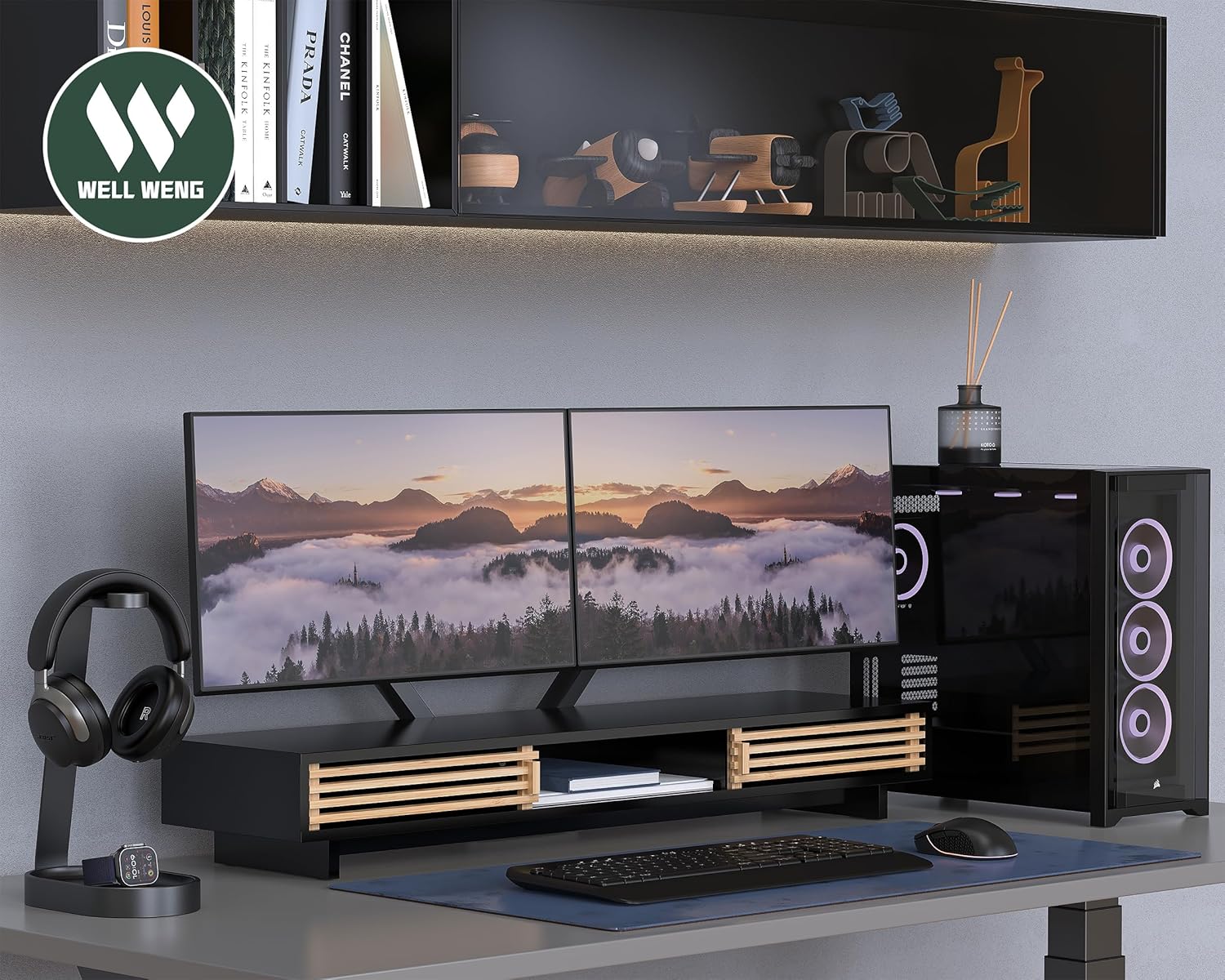 Dual Monitor Stand Riser with Sliding Door, Double Computer Laptop Stand Desk Shelf Organizer with Storage (Black + Natural Bamboo, 38 Inch)