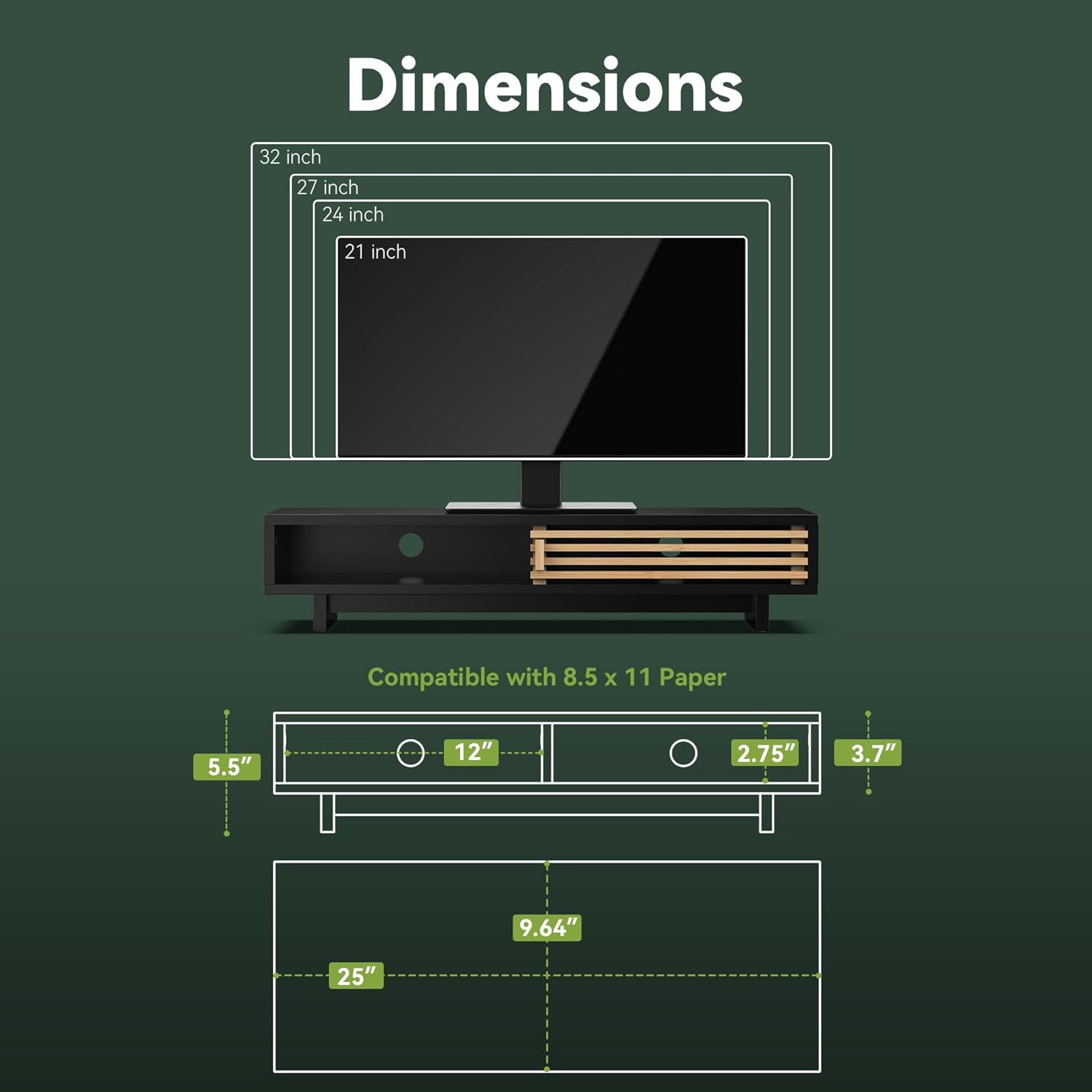 Monitor Stand Riser with Sliding Door, Computer Laptop Stand Desk Shelf Organizer with Storage (Black + Natural Bamboo, 25 Inch)