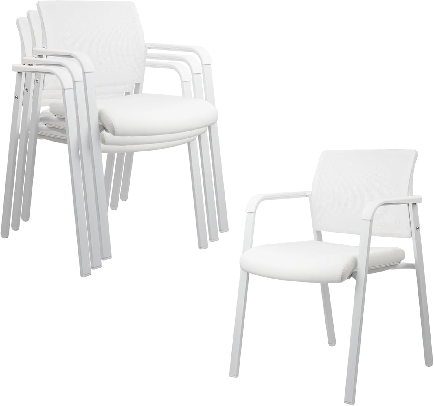 CLATINA Stacking Office Chairs | Mesh Back, Thicken Leather Seat and Arms, Ergonomic Lumbar Support | Guest Reception, Waiting, Conference, School, Party, Customer, Side, Stationary | Set of 4, White