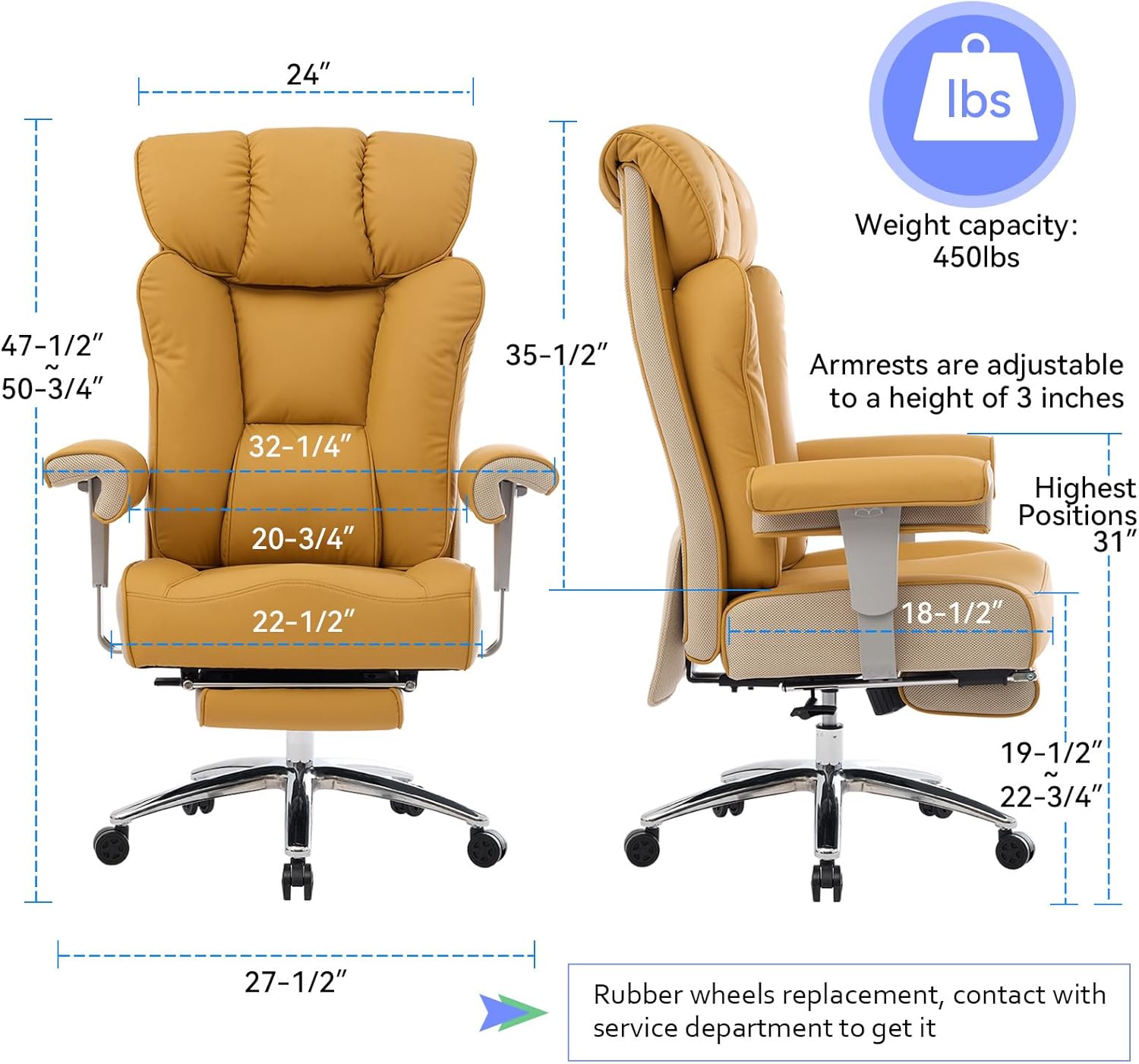 Efomao Big and Tall Green Office Chair 450LBS – Ergonomic High-Back Executive Chair with Footrest, Adjustable Padded Armrests, PU Leather Computer Chair with Lumbar Support for Home or Office, Yellow