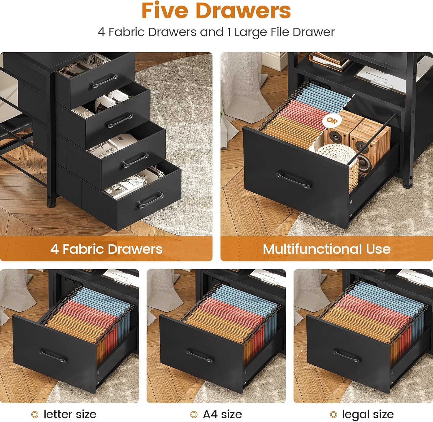 - 【5 Large Storage Drawers】Coming with a file drawer, fabric storage drawers, printer cabinet and open shelves with powerful storage space. File cabinet can hold letter/A4/legal files. This solid constructed computer desk could hold printers, scanners, fax machines and any other office machines, keeps printer or scanner within easy reach of your desk to free up work space.