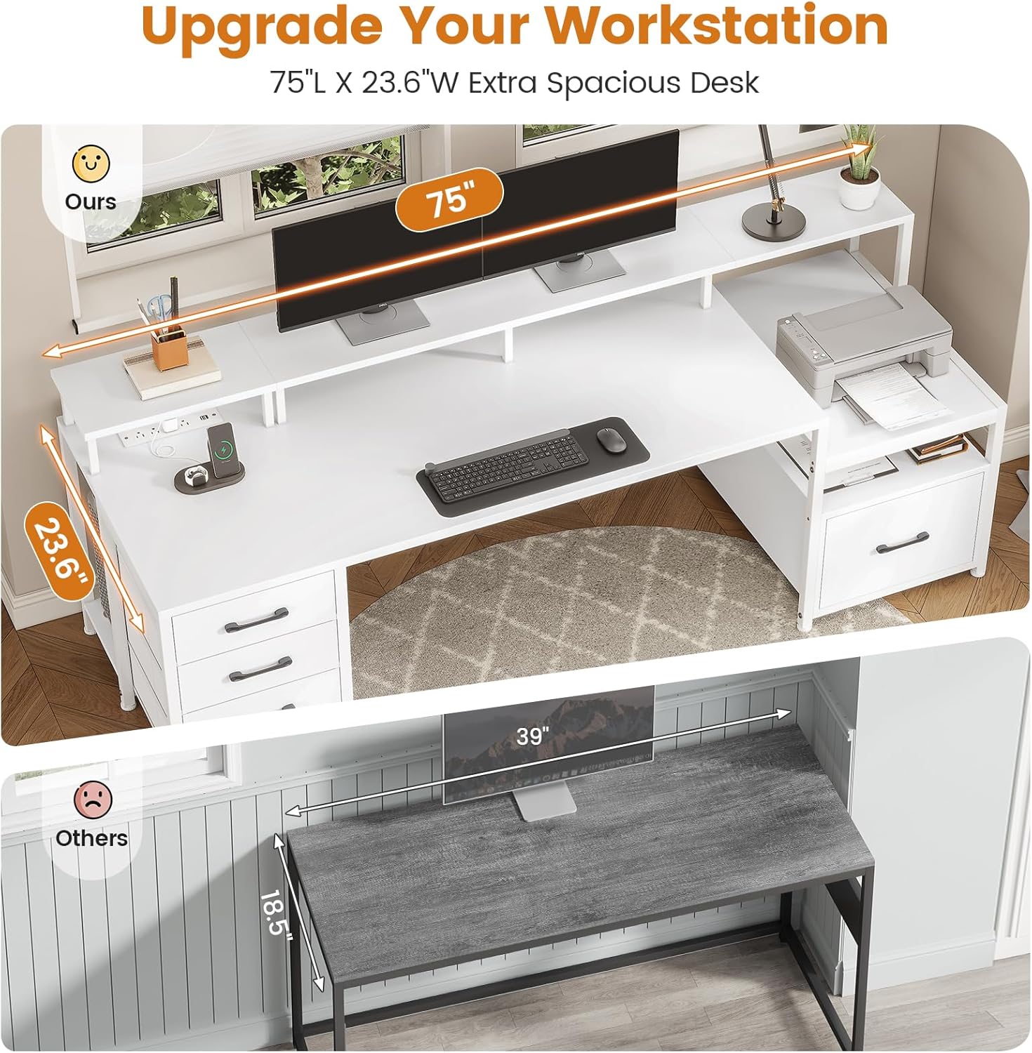 - 【23.6”W Large Desktop】75"(L)*23.6"(W) dimension can easily accommodate your laptop, keyboard, books, files, desk accessories. The large workstation can hold 2 computers at the same time. Use this computer monitor riser to easily raise your monitor to just the right height, reduction of back and neck strain and pain, and frees up tons of workspace below.