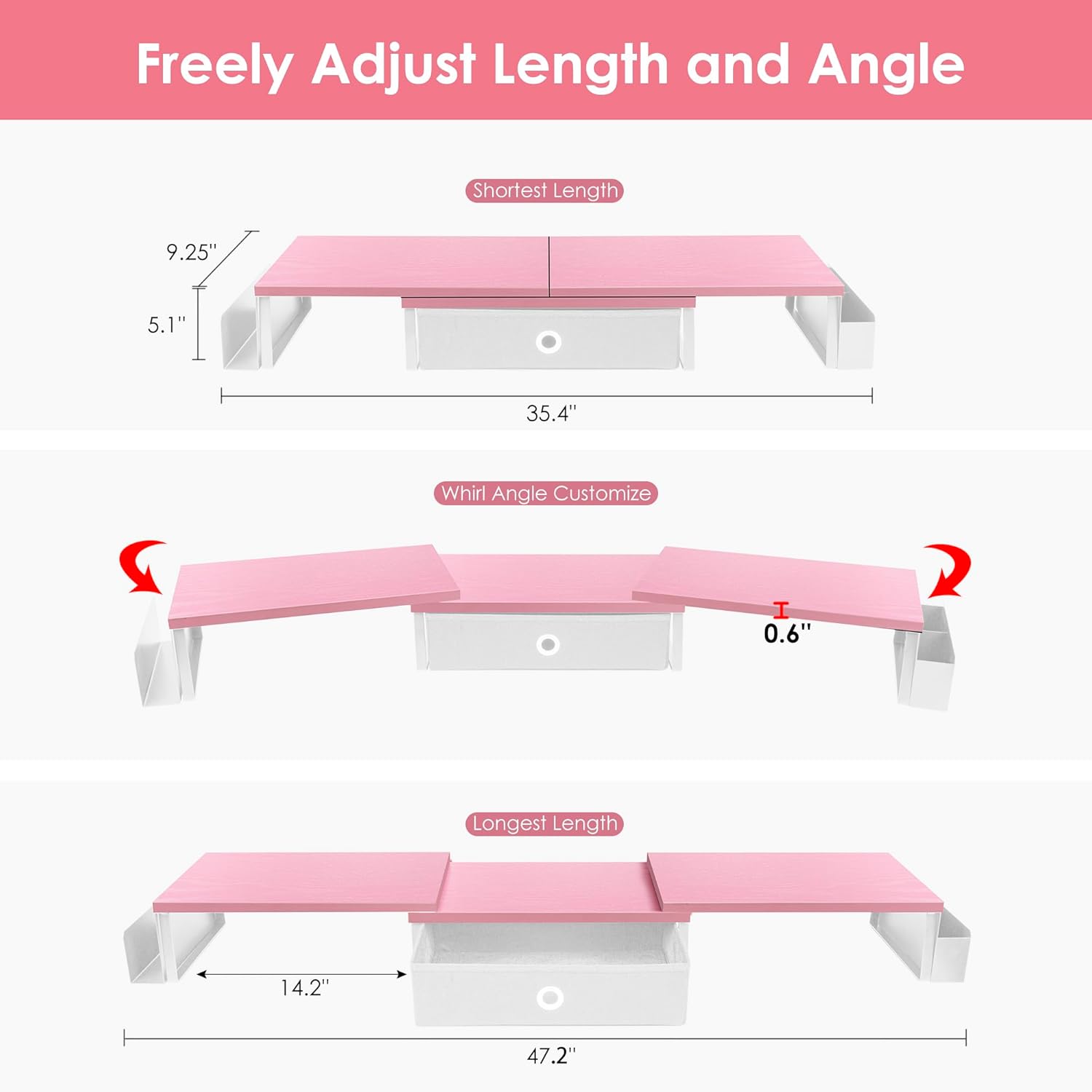 - 【Adjustable Angle & Length】The length of monitor stand riser with drawer can be adjusted from 35.4 to 47.2 inches, and angle can be adjusted +/-90 degree to meet various office needs and obtain a better viewing experience. If you need multiple computers to work at the same time, you might as well choose our extra large monitor riser for 2 monitors. It is a must for office desk organizers and accessories.