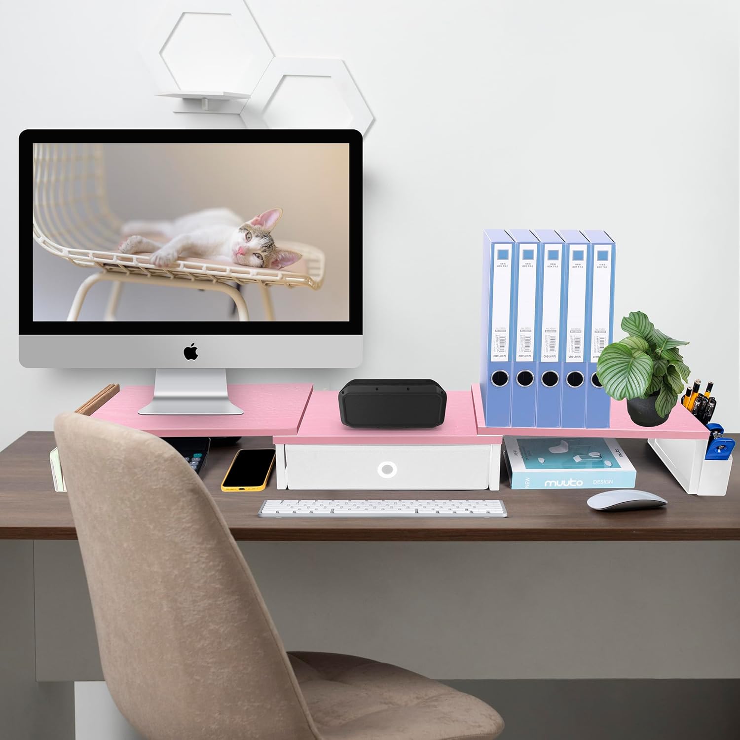 - 【Sturdy Computer Stand】Dual monitor riser with drawer is made of high quality MDF wood and solid steel legs. Desk shelf for monitor with metal feet can provide strong support and load-bearing. Non-slip rubber pads could prevent slipping or damage to your desk and it is a good desk organizer in pink for women.