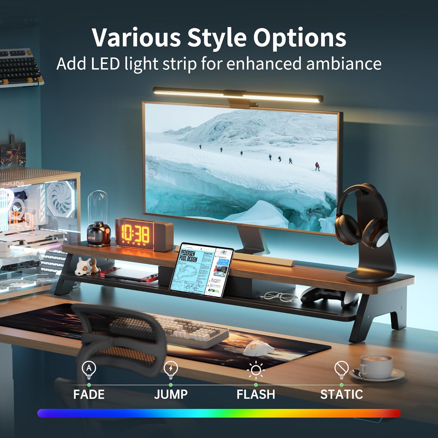 - LED Light Strip:Featuring an integrated LED light strip, this riser adds a soft, ambient glow to your workspace. It not only enhances your desk lighting but also creates a modern, stylish atmosphere, perfect for both work and relaxation.