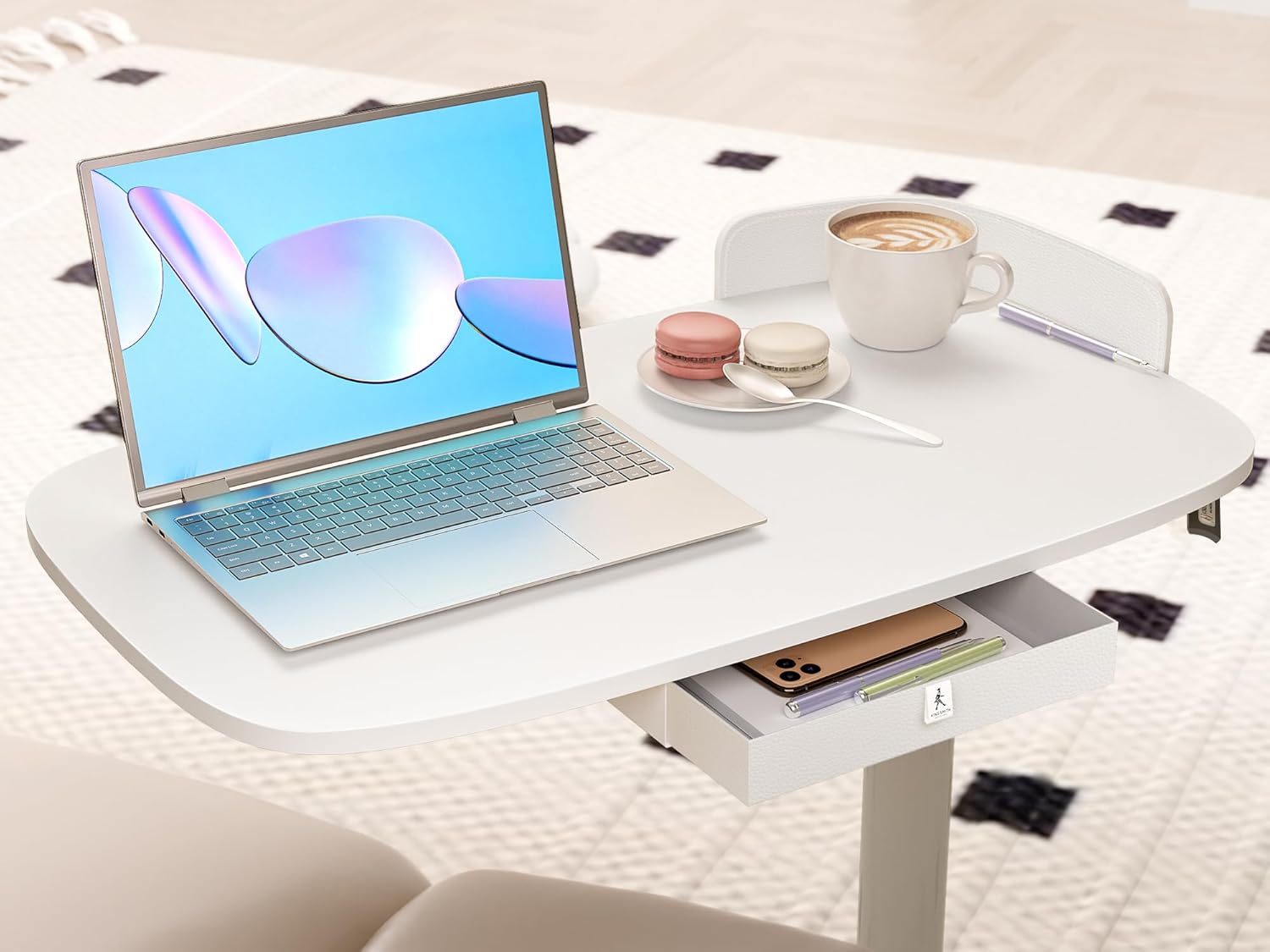 Rolling Desk Adjustable Height with Drawer and Wheels, Portable Small Standing Desk Pneumatic for Home Office, Mobile Computer Laptop Cart, Medical Sofa Overbed Table, White