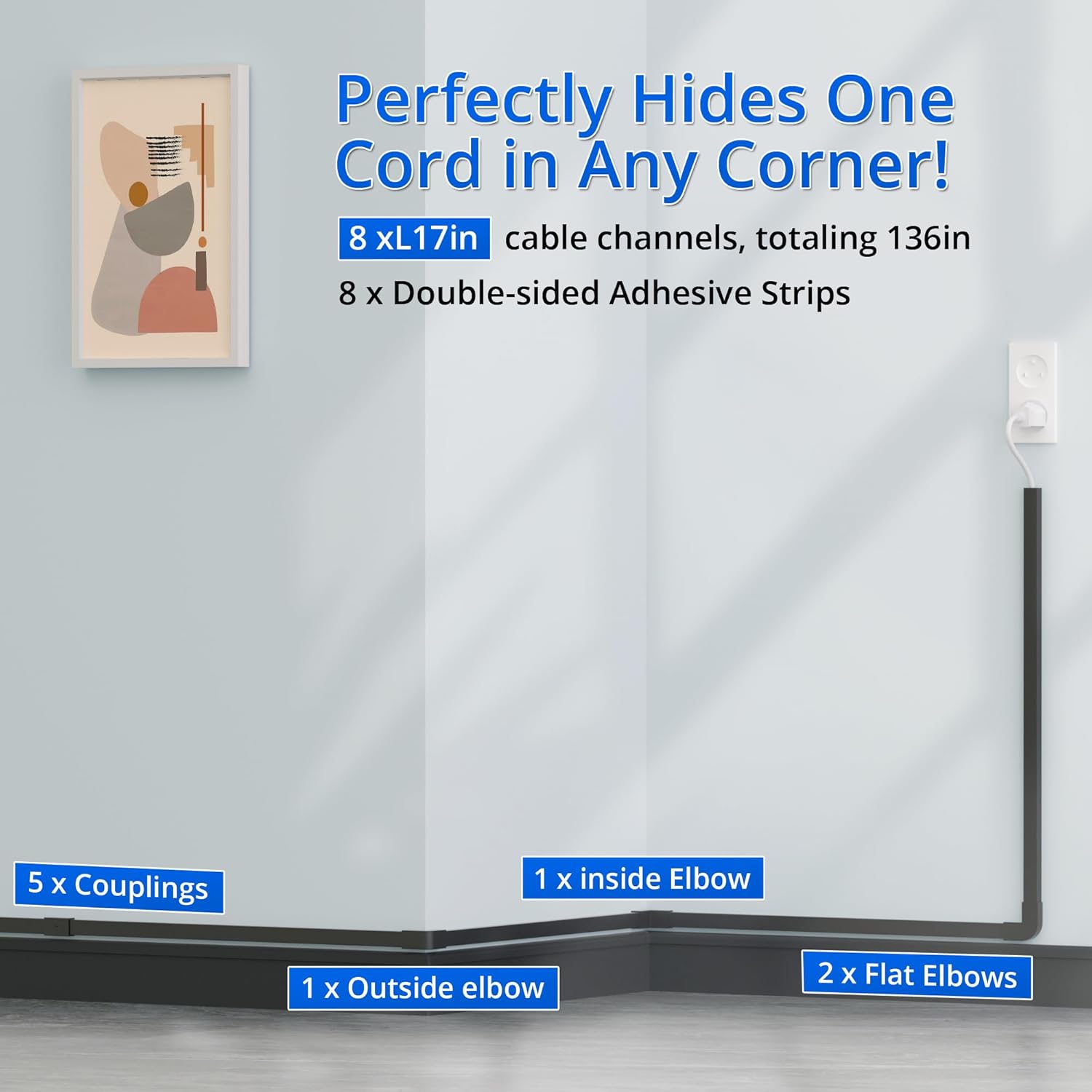 - 136-inch Cable Concealer (Not a single long piece): This cable management kit includes 8 channels, each cable channel measuring 17’’ long x 0.59’’ wide x 0.40’’ high; Smooth edges allow seamless connections. Accessories comprise 5 couplings, 2 flat elbows, 1 inside elbow, 1 outside elbow. Pre-Applied Premium PE Tape