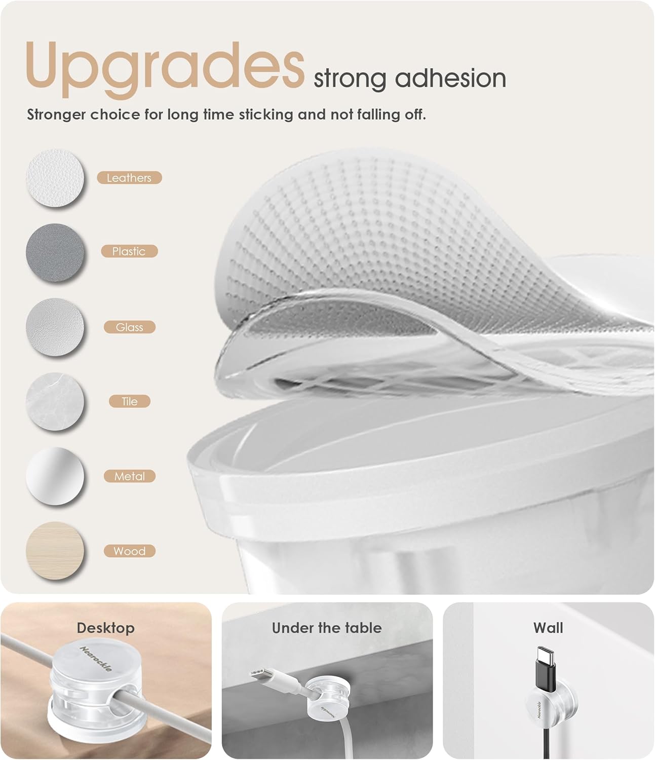 - 【No-Residue Acrylic Adhesive】Using upgraded acrylic adhesive, it is stronger and will not leave any residue when peeled off. Simply stick the cable organizer to any smooth, dry surface such as a wooden table, glass or tile, etc. the transparent adhesive pads won't damage your table, nightstand or walls. [Warm Tips: Please clean the desired surface without dust before sticking, and keep pressing for 30 seconds to enhance the adhesion of the sticky pad. Highly recommend waiting for 1 hours for better use]