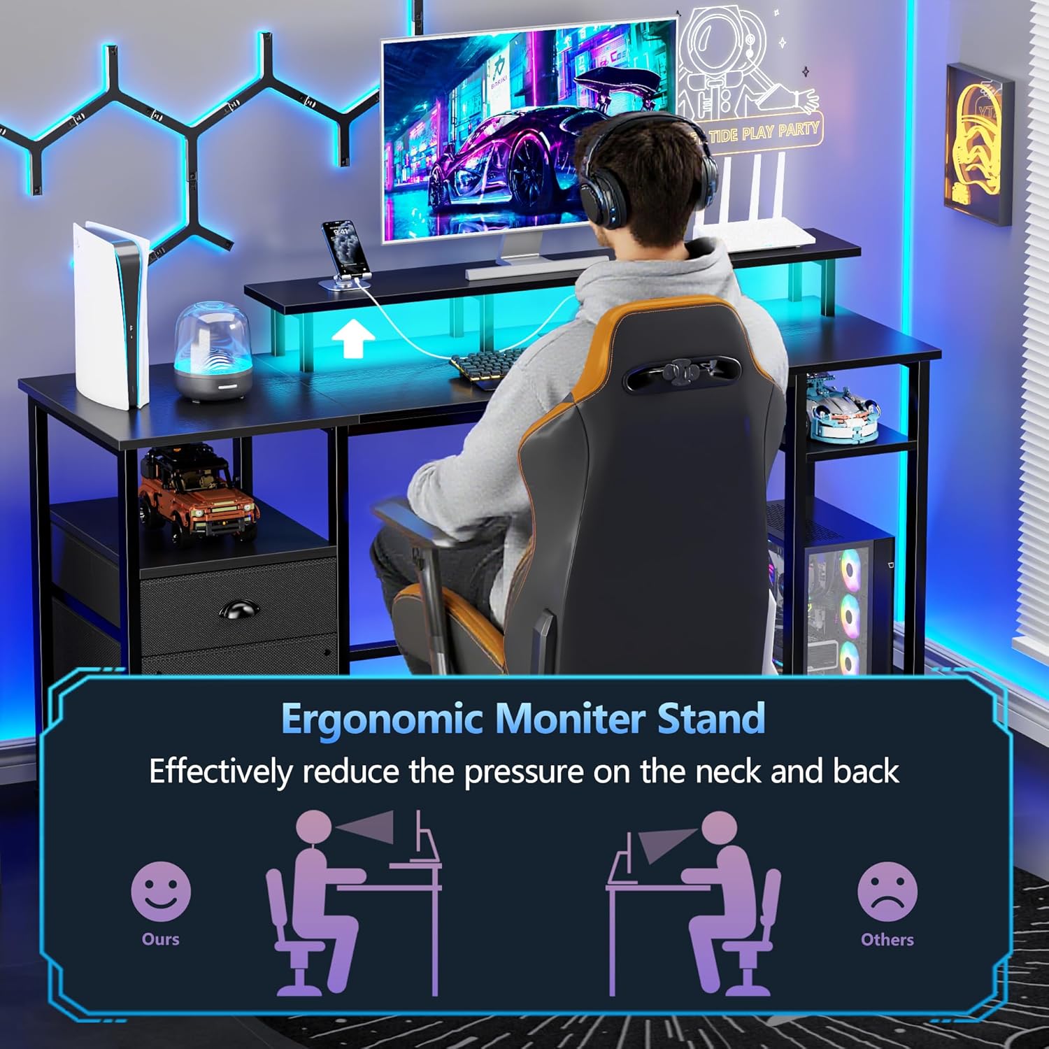 - 61 in Office Desk with Monitor Stand: Can meet your requirements for placing 2 monitors. The monitor shelf can easily raise the screen to the level parallel to the eyes, promote good posture, more ergonomic design, and effectively reduce the pressure on the neck and back