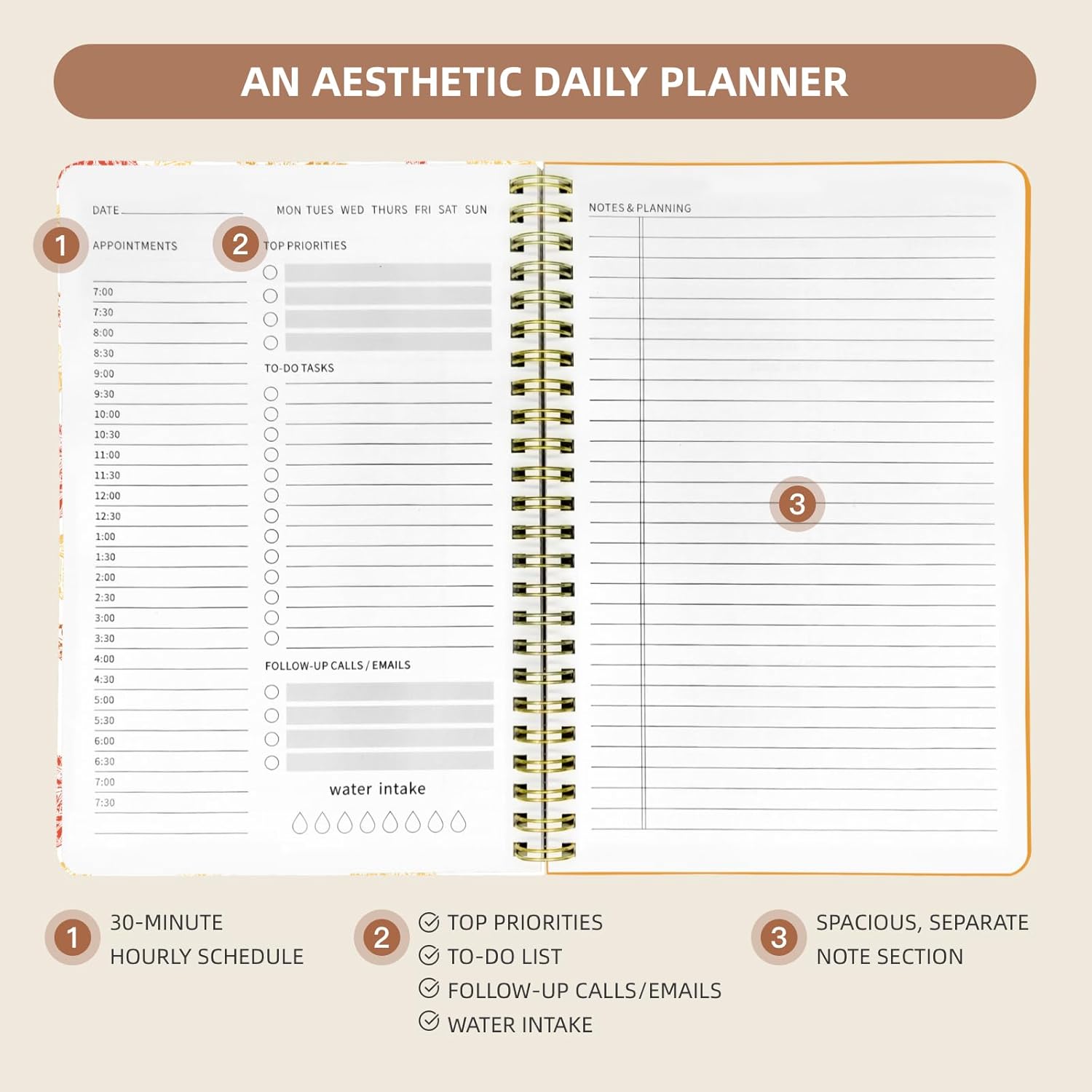 - Functional Planner: Hourly Schedule, To-Do List, Follow-Up Task Section, Water Intake Tracker, Blank Lined Notes Page