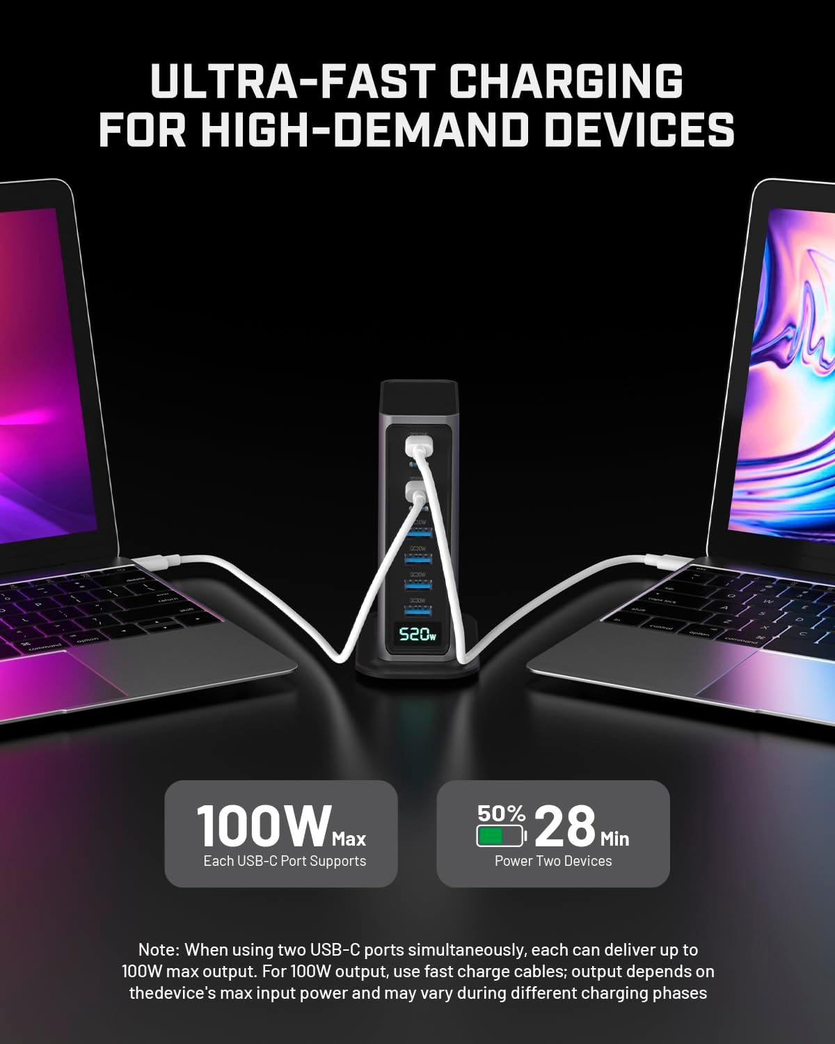 - 【520w Super Power 8-in-1 Fast Charging Station】No need to wait, quickly charge your computer, mobile phone, watch, headphones, fans and etc 8 devices at the same time. For example, you can charge four 14-inch MacBook Pros to 50% power in 28 minutes. Supports maximum output of 100 watts, which can reduce the burden of accessories, improve charging efficiency, and save your money and time.
