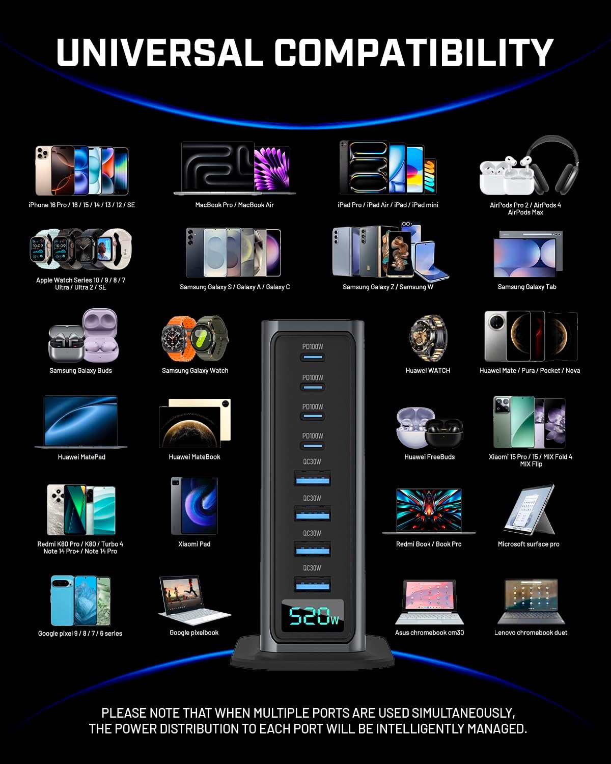 520W USB C Charger Block, 8 Ports GaN Fast Charging Station Hub, PD 100w Type C & USB A Laptop Desktop Charger Adapter for MacBook Air/Pro, DELL, iPhone, iPad, Samsung, Travel Home Office Use
