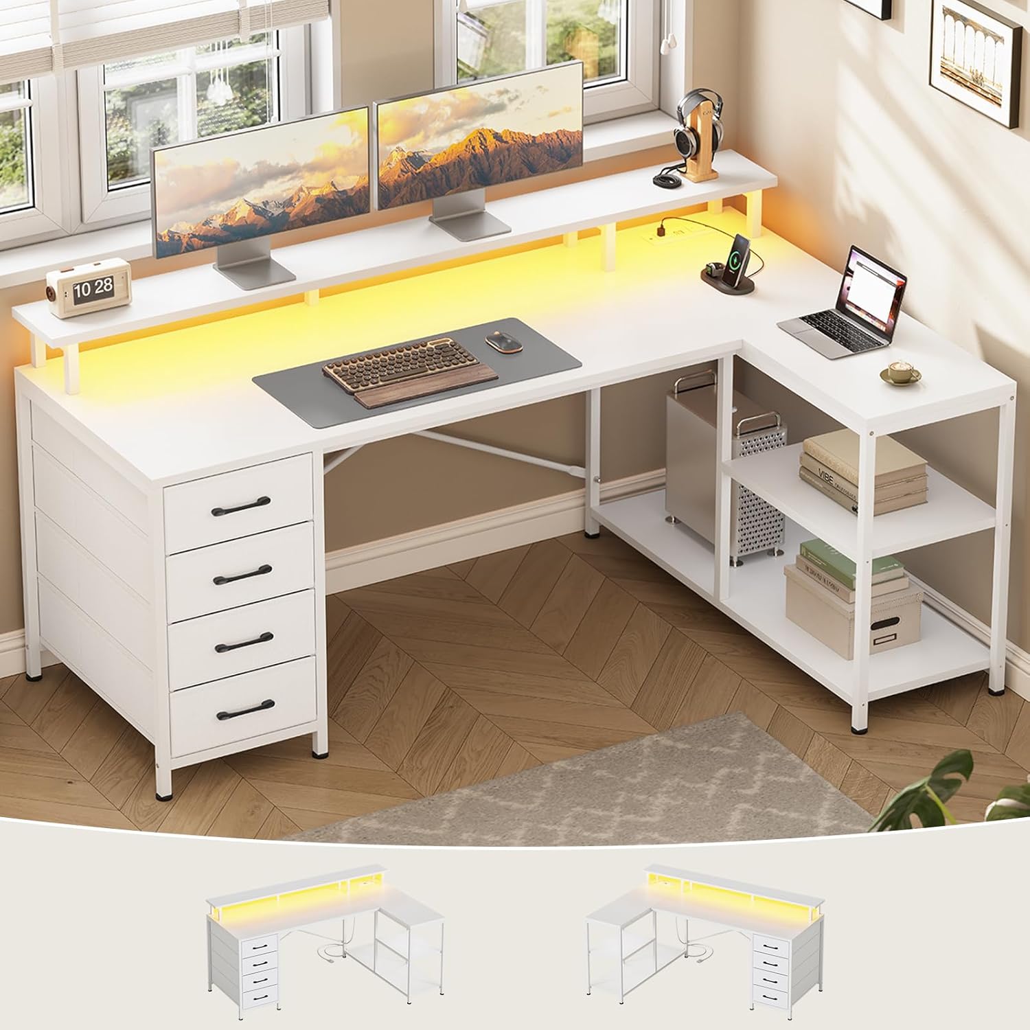 SEDETA L Shaped Desk with 4 Drawers and Storage Shelves, L Shaped Gaming Desk with LED Lights & Power Outlets, Computer Desk with Shelves & Drawer, Corner Desk Home Office Desk, White