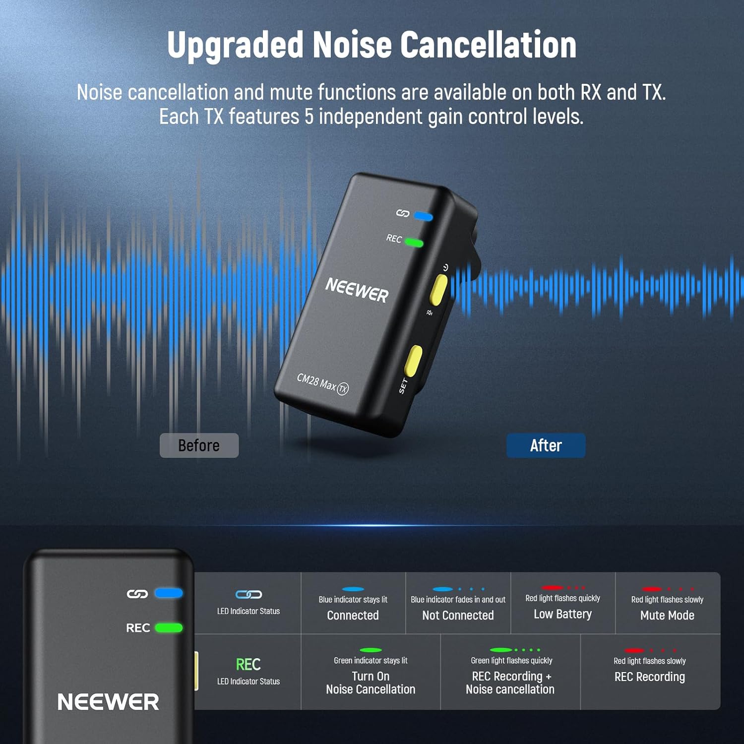- 【1 Click Noise Cancellation & Mute】 On RX: Double press the power button to activate mute function; single press the SET button to adjust the output volume from level 1 to 5; double press the SET button to activate noise cancellation function. On TX: Single press the power button to independently adjust the microphone input gain control in 5 levels