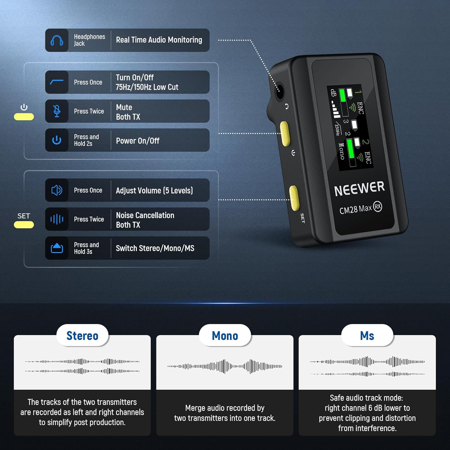 NEEWER CM28 Max Wireless Lavalier Microphone System with Charging Case 48KHz/24Bit Lossless Float Recording Noise Cancellation 8GB Storage 25Hrs Battery 300m Range for iPhone iPad Android Camera PC