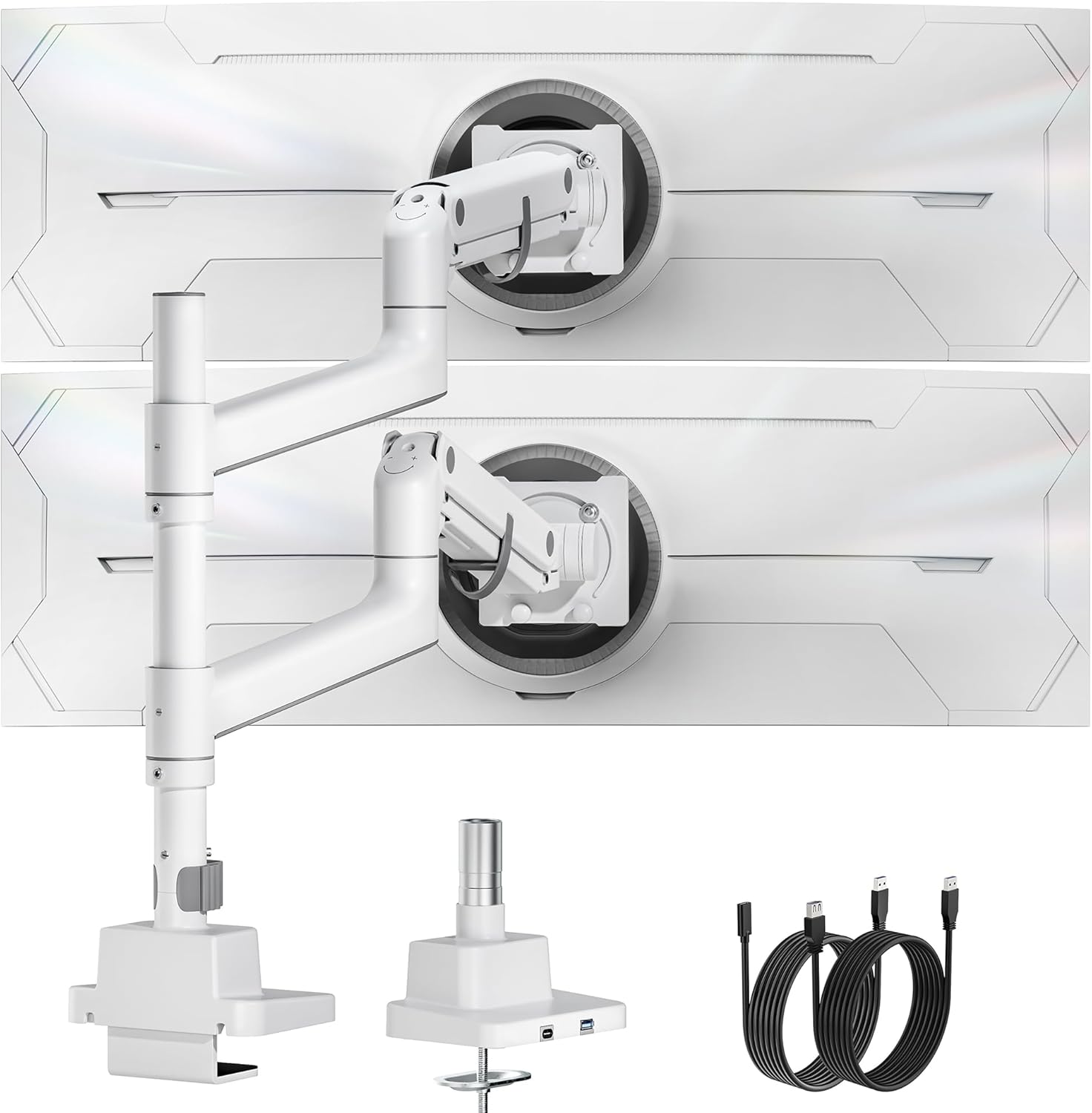 monTEK 17-57 Inch Dual Ultrawide Monitor Arm for Up to 59.4lbs Screen, Aluminum Heavy-Duty Gas Spring Vertical Stackable Curved Screen Adjustable Monitor Stand,75/100mm Vesa Mount, White