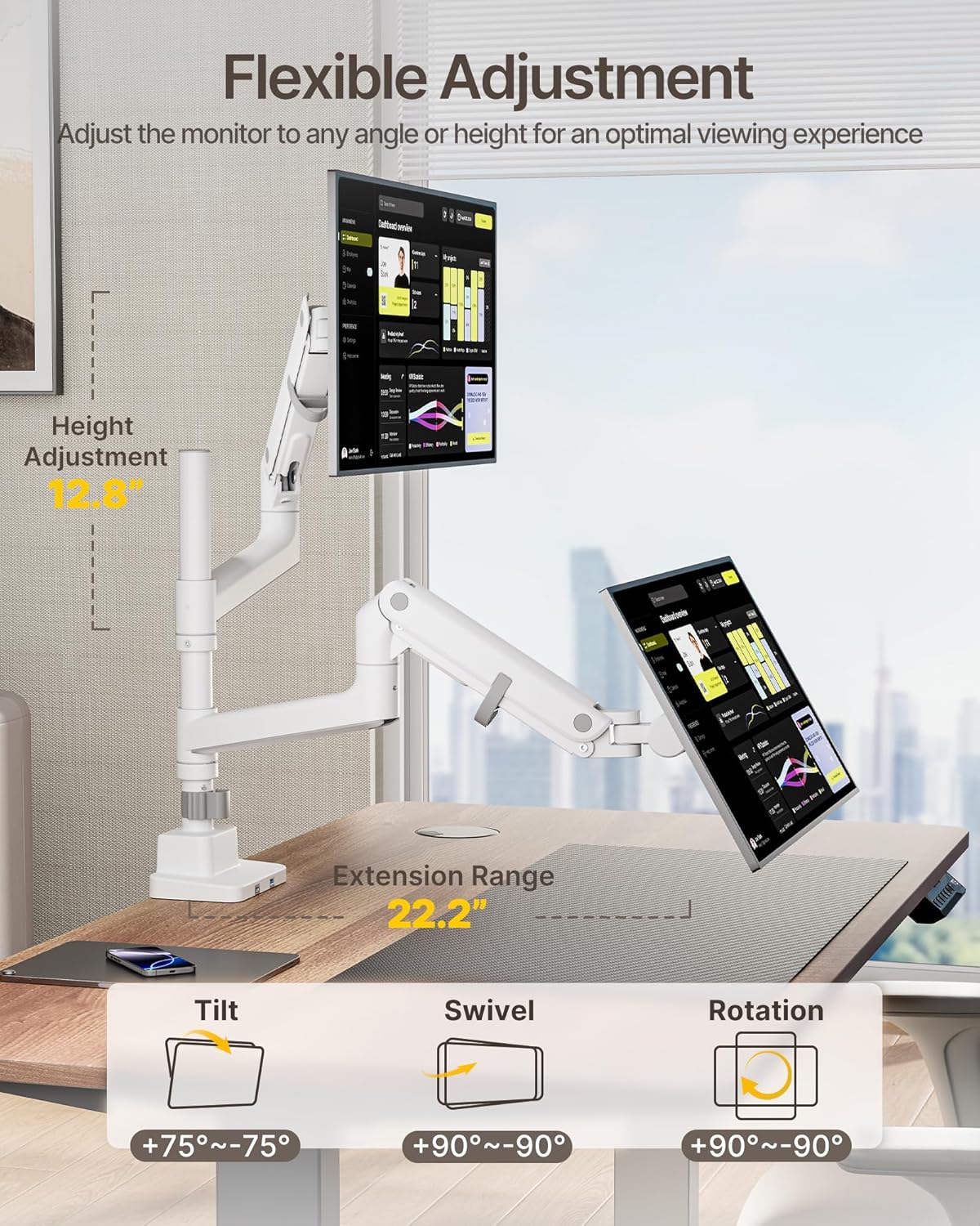 - 【Ergonomic Precision & Flexibility】:Tilt (-75° to +75°), swivel (±90°), and ±90° screen rotation allow effortless customization of your viewing angles, reducing neck.19.2" height pole adjustment and side-by-side or vertical stacking for dual-monitor setups. The monitor arm height range up to 29.4", and extends up to 22.2" to help you achieve the perfect viewing angle.