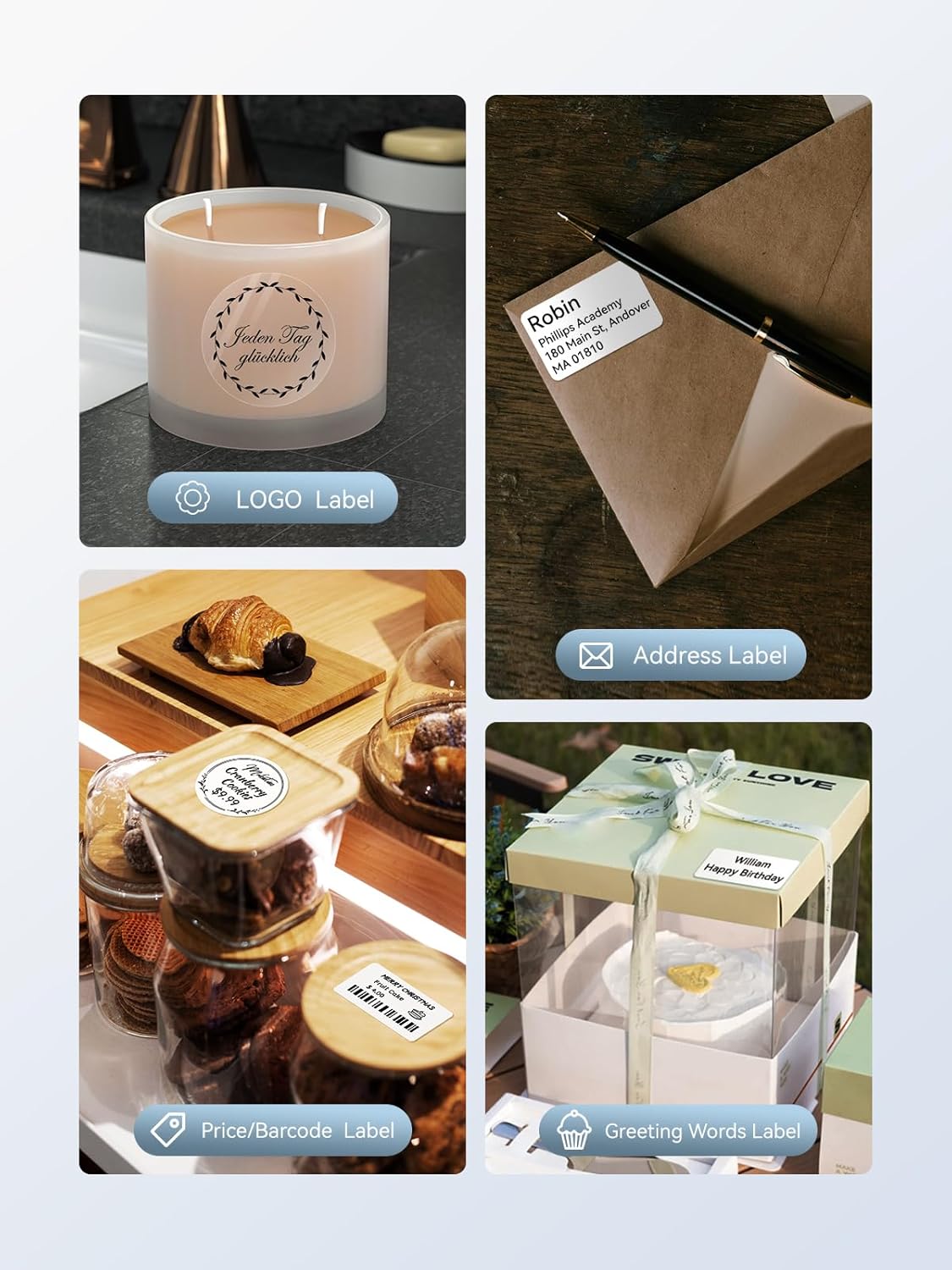 - 【Widely Use】This bluetooth label maker machine supports label width from 20 to 50mm, perfect for home (kitchen food and spices jars, bottles,storage boxes, homemade food,return address), for small business (price,product info, QR code, barcode, brand logo,ads), for school (name tag, teacher fast feedback label,clothes label,cup label)