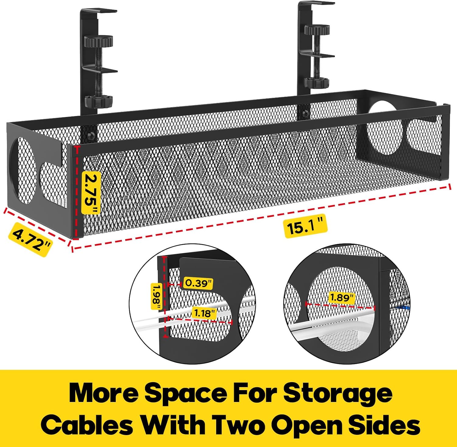 Under Desk Cable Management Tray No Drill 15.1’’, Metal Mesh Cable Management Box with Hybrid Side Slots Cable Raceway,Adjustable Cable Tray with Wire Management for Office Home,1 Pack (Black)