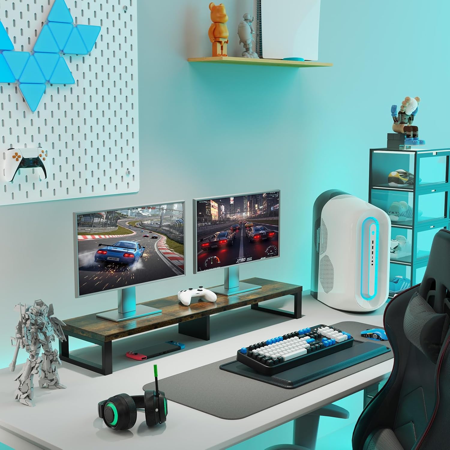 - Spacious Storage Underneath: This dual monitor stand riser hides full-size keyboards (up to 18.8"), mice, and office gear in its sleek undercarriage storage – essentials stay accessible while clutter disappears.