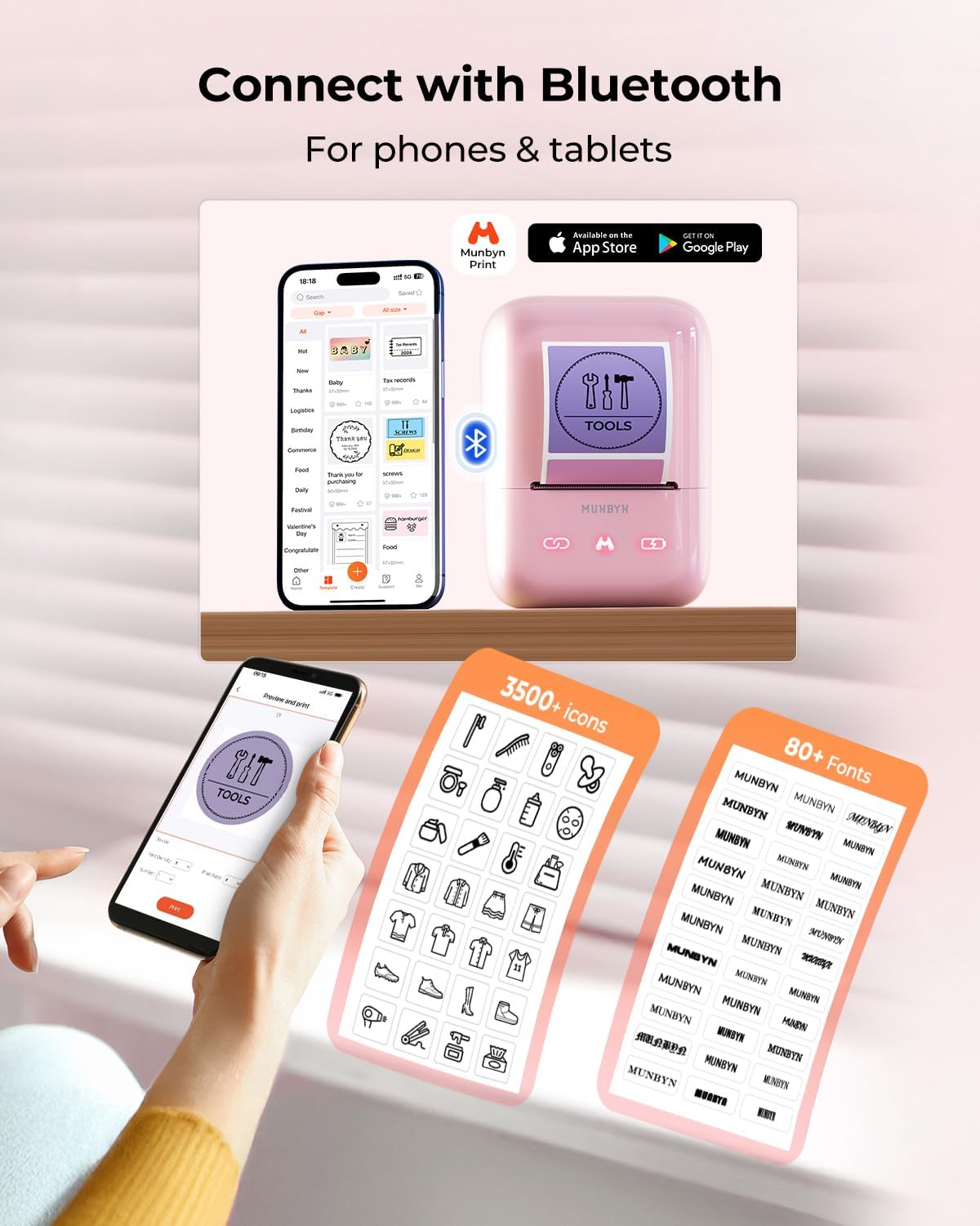 - [Smart App with a Massive Library] The Munbyn Print app (compatible with iOS and Android) provides access to over 80 fonts, 3,500+ icons, and 2,000+ templates in 7 languages. Easily customize your labels to meet the needs of various applications, including office, business, apparel, and storage