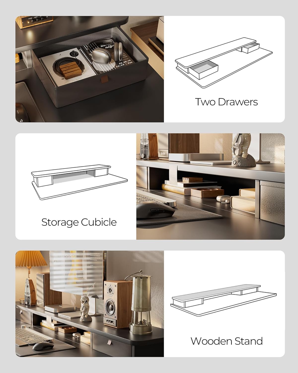 - Spacious Work Space: The top shelves with double drawer design expertly make your desktop tidier and helps you head up when you put your screen on it