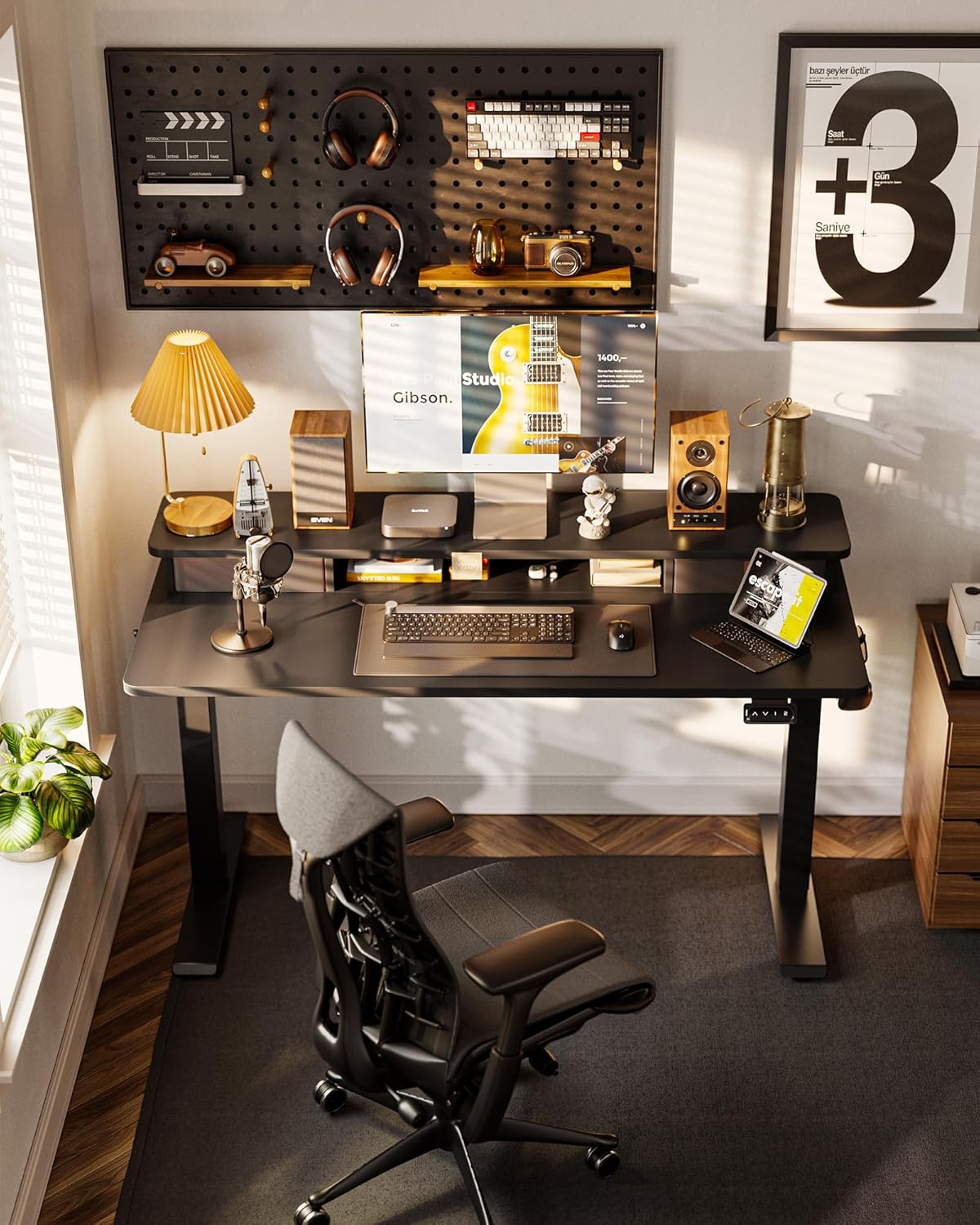 FEZIBO 60 x 24 Inch Height Adjustable Electric Standing Desk with Double Drawer, Computer Desk, Home Office Stand Up Table with 4 Height-Adjustable Feets & 2 Hooks, Black