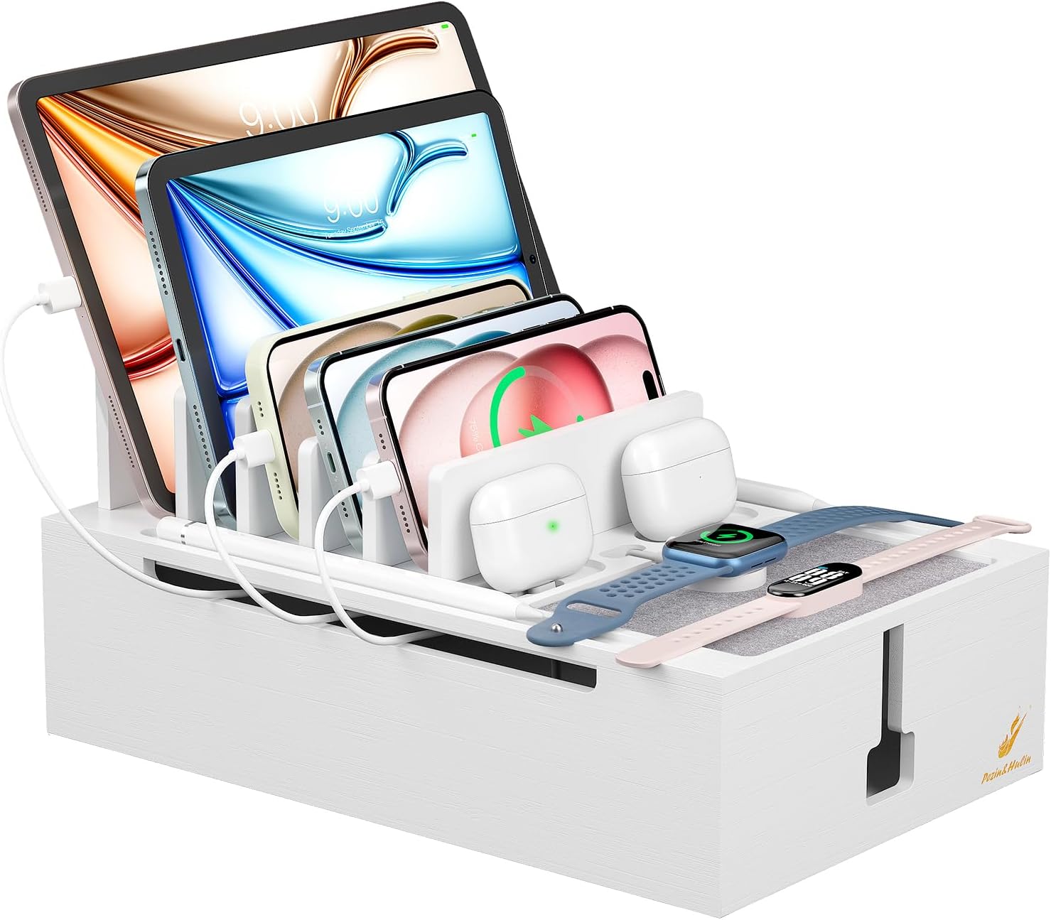 - Charging Station for Multiple Devices: Pezin & Hulin charging station is made of solid bamboo that will last for years to come.It can hold up to 8 devices, keep all your devices in one place without having to deal with cables running around everywhere. It is ideal for company, office, living room, bedroom, kitchen, hotel, restaurants and classroom (PLEASE NOTE: The charger HUB power supply and Cables is not included in the package)