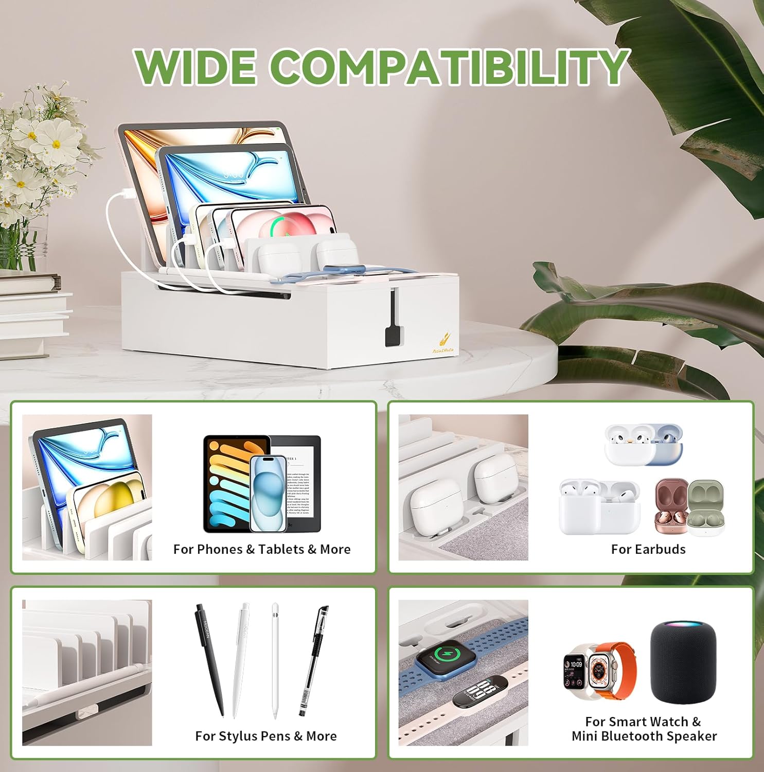 - Creative Design: Our Charging Station designed with a wide flat tray with felt pad not only aesthetic, but also can prevent your items from being scratched. Spacious 6 baffles can hold your phones, tablets or game consoles no matter how thick case on. 4 special grooves can organize your earbuds and stylus pens (Each part is designed with data cable holes for easy