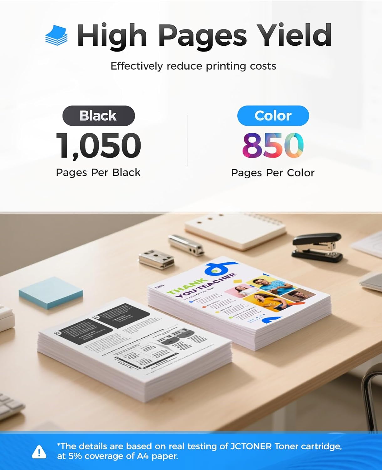 - High-Yield: up to 1,050 pages per 215A Black and 850 pages per 215A Color (Total 3,600 pages, 5% coverage).