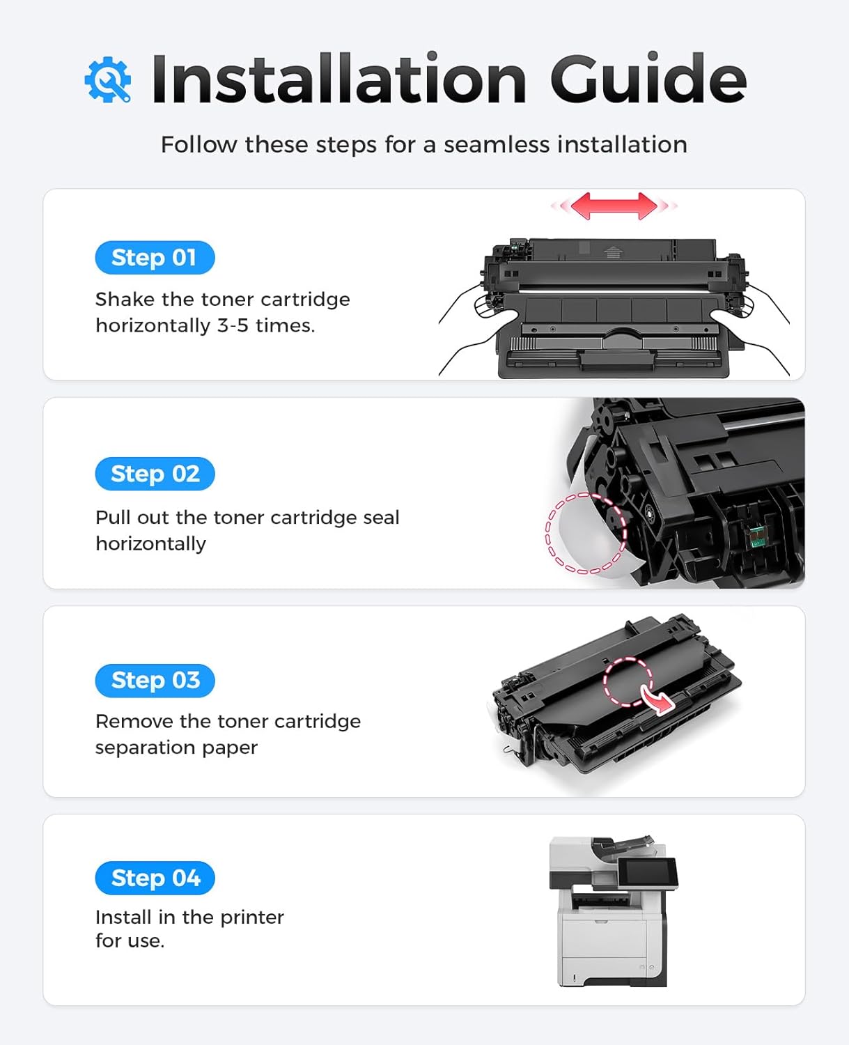 - The latest chip version: The JCTONER toner cartridges are equipped with the latest version of built-in chips, ensuring perfect compatibility between each toner cartridge and the printer. This enables you to print efficiently while maintaining stability and reliability, making installation convenient without the need for manual adjustments. All JCTONER toner cartridges have undergone strict quality testing and have obtained ISO9001 certification. High-quality toner cartridges can meet the demand for high printing volume. The fine toner ensures clear and stain-free printing results and extends the lifespan of the printer. You can purchase with confidence.