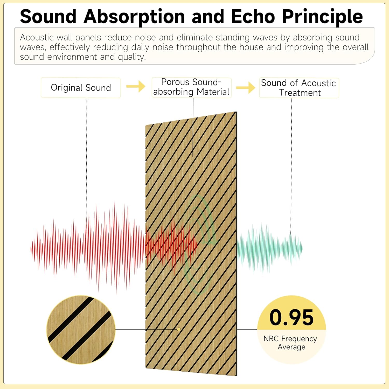 - REDUCING NOISE POLLUTION: Acoustic panels effectively reduce noise pollution by eliminating echoes and background sounds through superior sound absorption. These high-quality wall panels offer exceptional sound control with an outstanding NRC rating of 0.95, absorbing up to 80% of ambient noise. By controlling unwanted reverberations, echoes, and standing waves, they create a clearer, more pleasant acoustic environment.